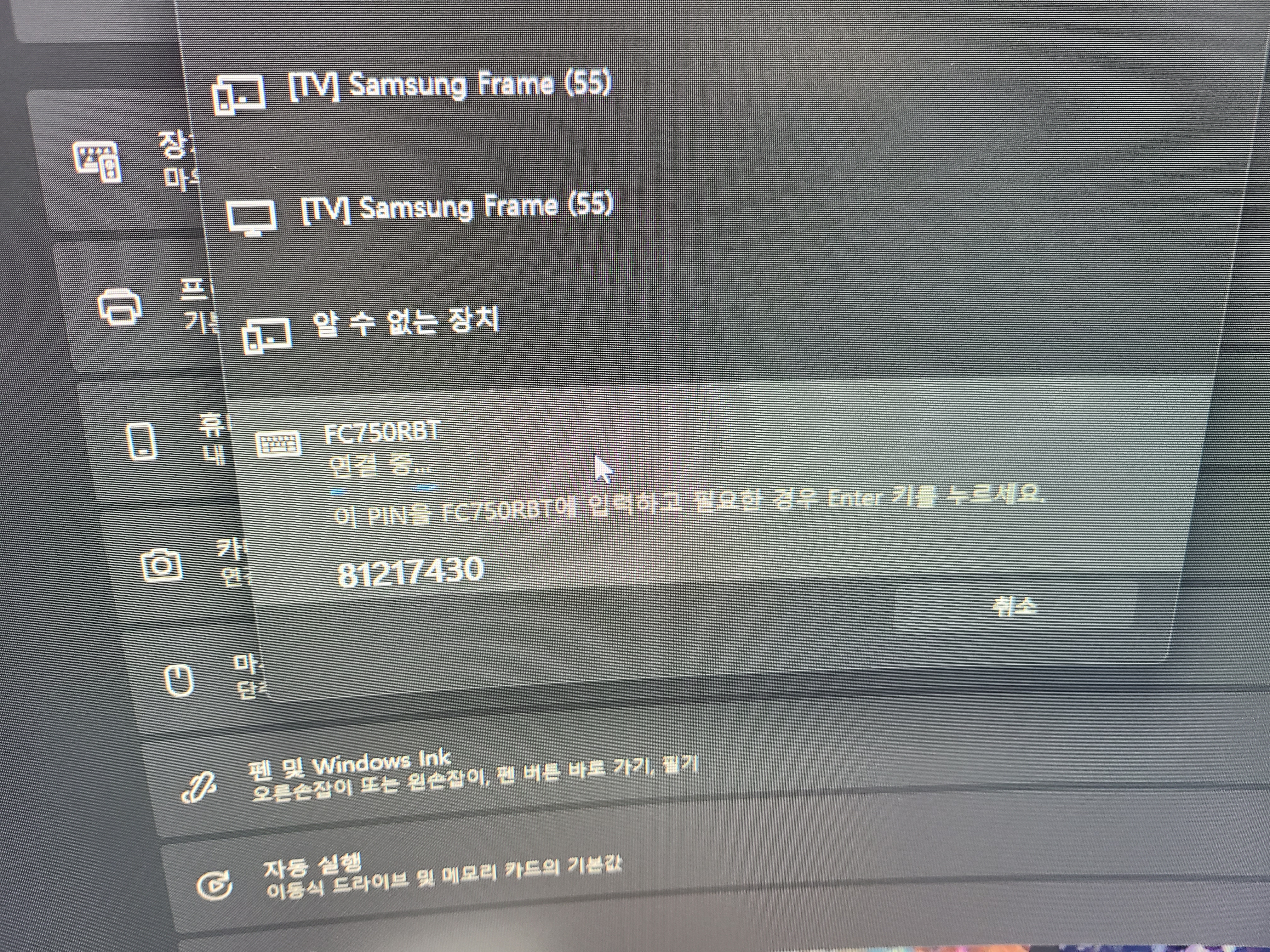 키보드 뒤편에 전원ON한 후 뽀족한걸로 BT똥꼬를 눌러줍니다. 그러면 전면 LEd가 점멸하는데 블루투스 장치 추가에 가면 키보드가 브라우징 되는것을 확인 할 수 있습니다. 여기서 화면에 표시된 번호를 눌러주면 등록이 완료됩니다^^
