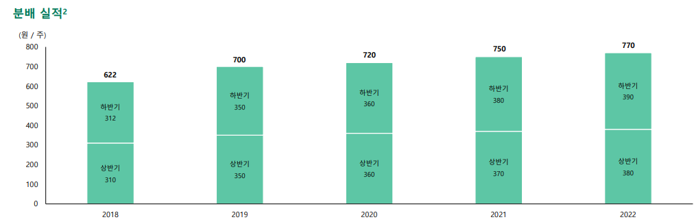 현금 배당 수익률은 최근 3년간 6%대로 배당주로서의 매리트는 매우 높습니다. 배당금은 연 2회 지급(6월말 기준/12월 말기준)으로 지급됩니다.