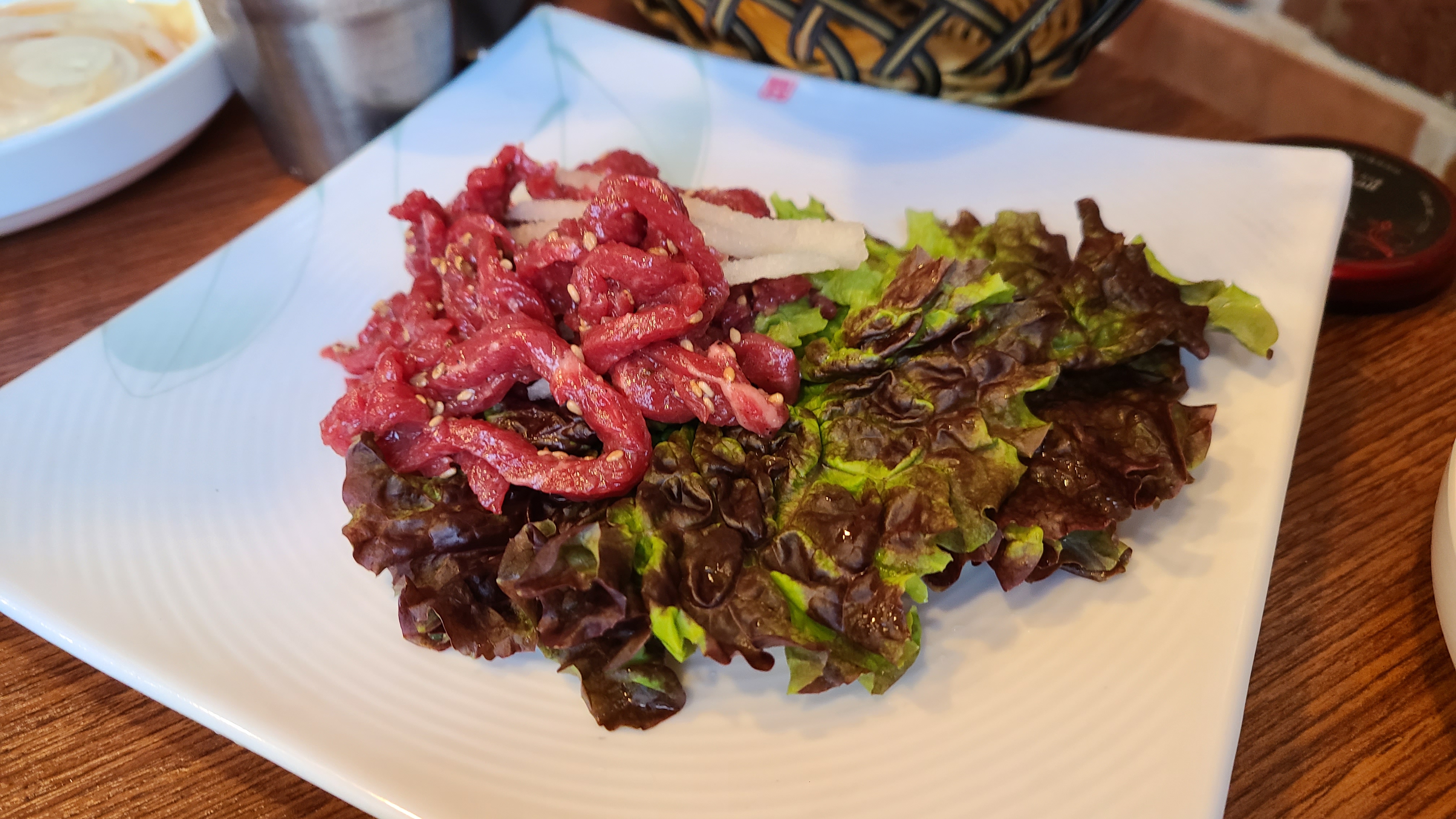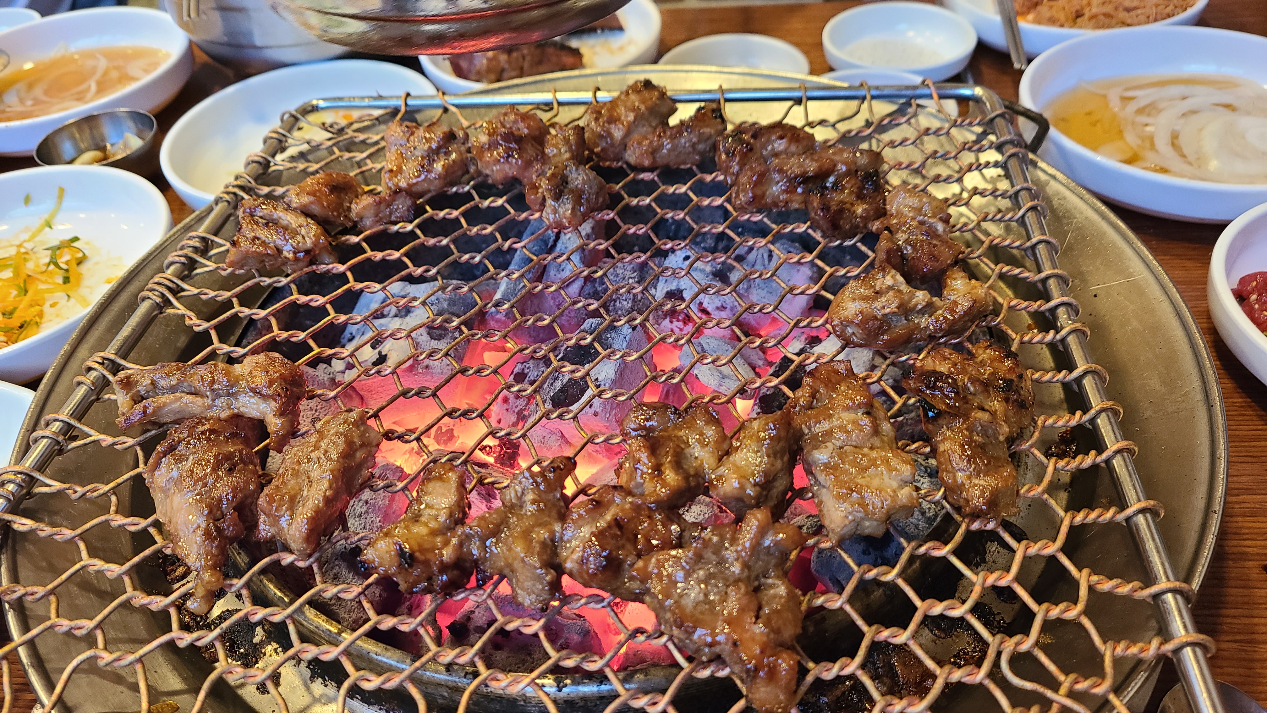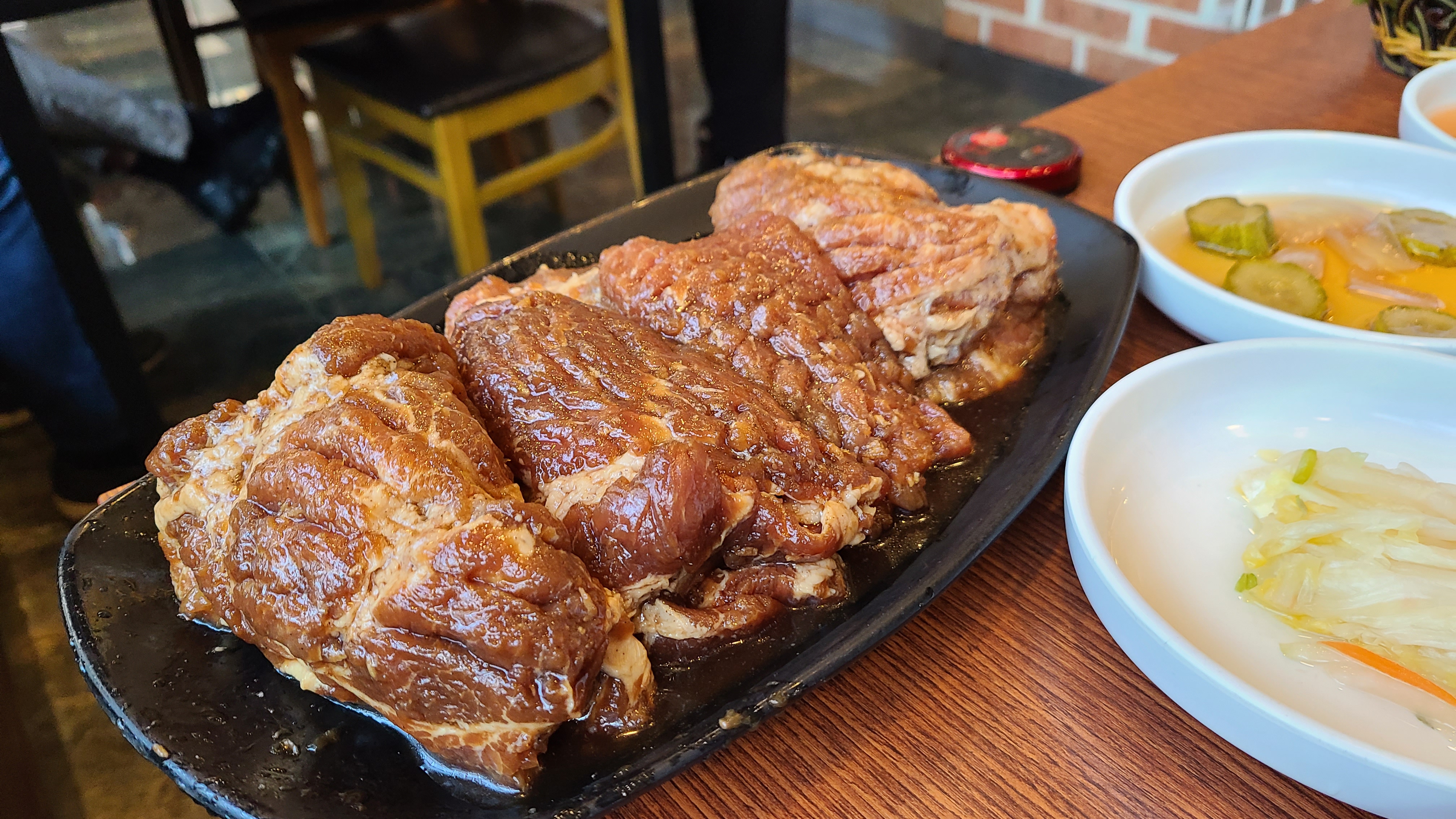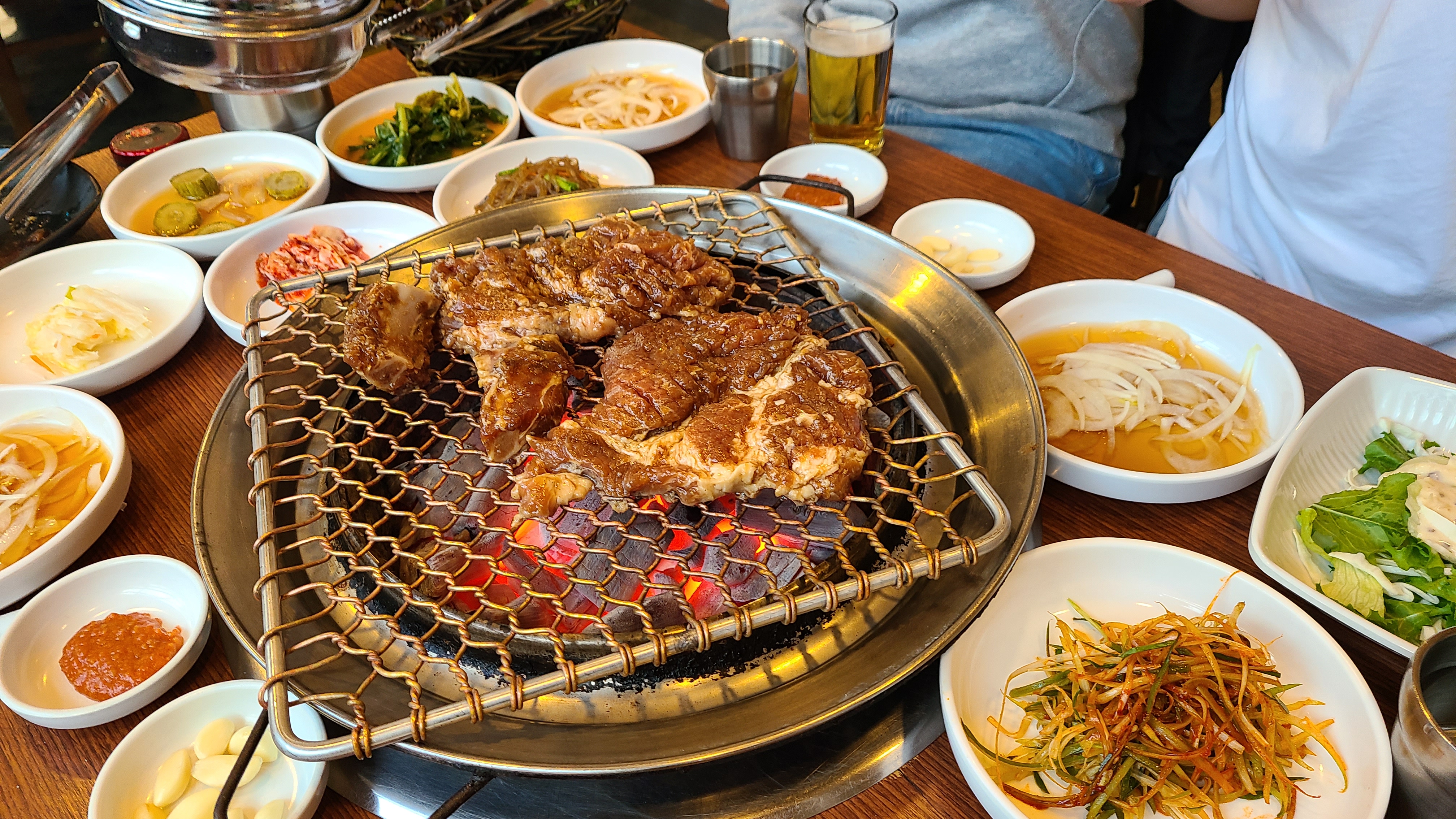 6. 불은 가스불이 아니고 숯불로 굽습니다. 그래서 인지 숯향이 고기의 특유의 잡냄새를 잡아준다고 할까요? 돼지왕갈비, 돼지양념갈비, 삼겹살, 육회 순서로 고기를 쭈욱 고기를 먹어보았는데 정말 고기질이 좋고 육즙이 살아 있었어요. 꽤 두껍게 고기를 썰어주셨는데 정말 맛이 좋았습니다. 고기는 역시 두꺼워야 맛이 좋아요.