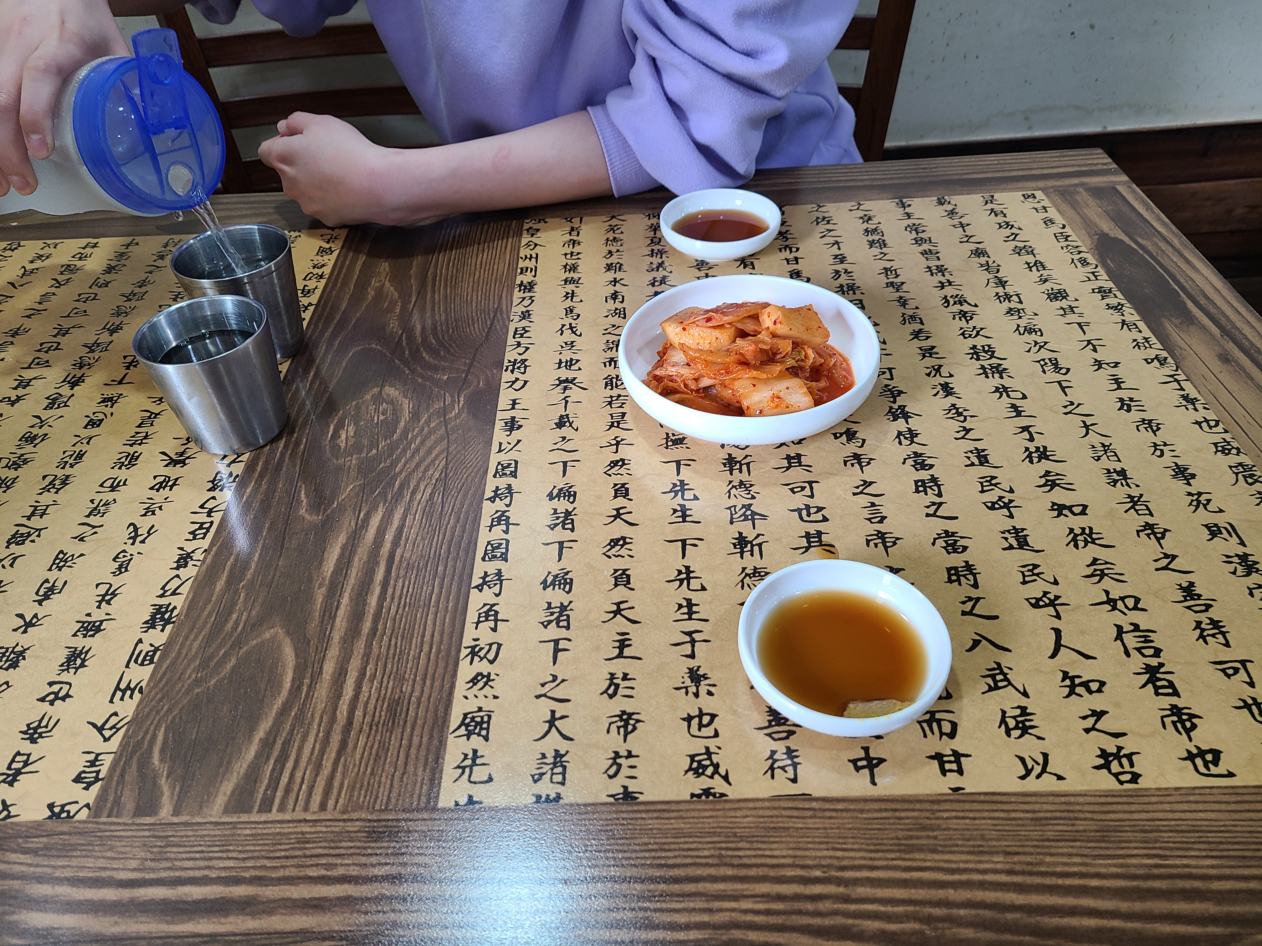 4. 먼저 쉰 김치/깍두기가 나오는데 이게 예술입니다. 리필을 한번 더 할 정도로 맛있어요. 그리고 소스 간장겨자 소스였어요. 고기 찍어 먹으면 맛있어요.