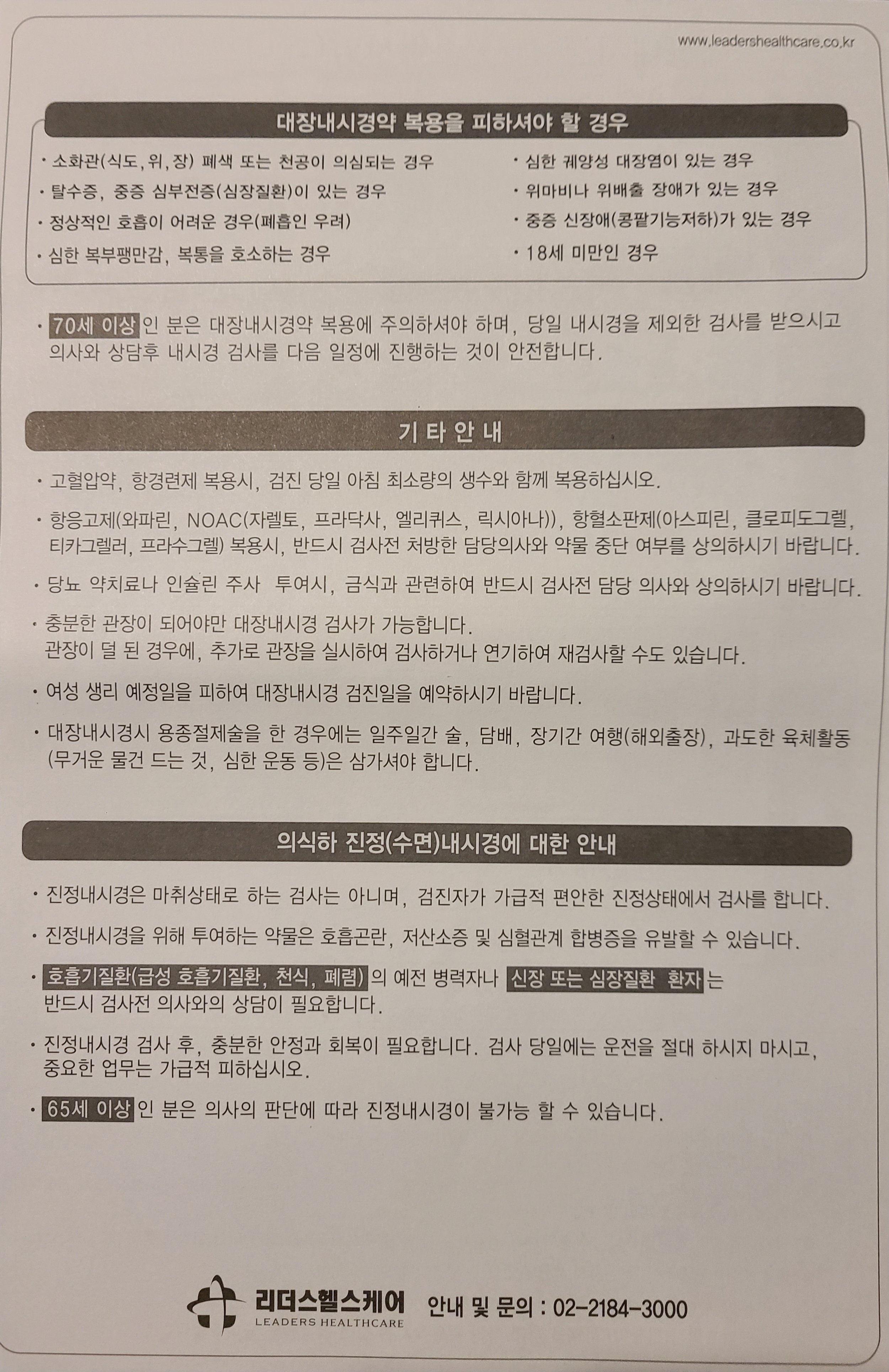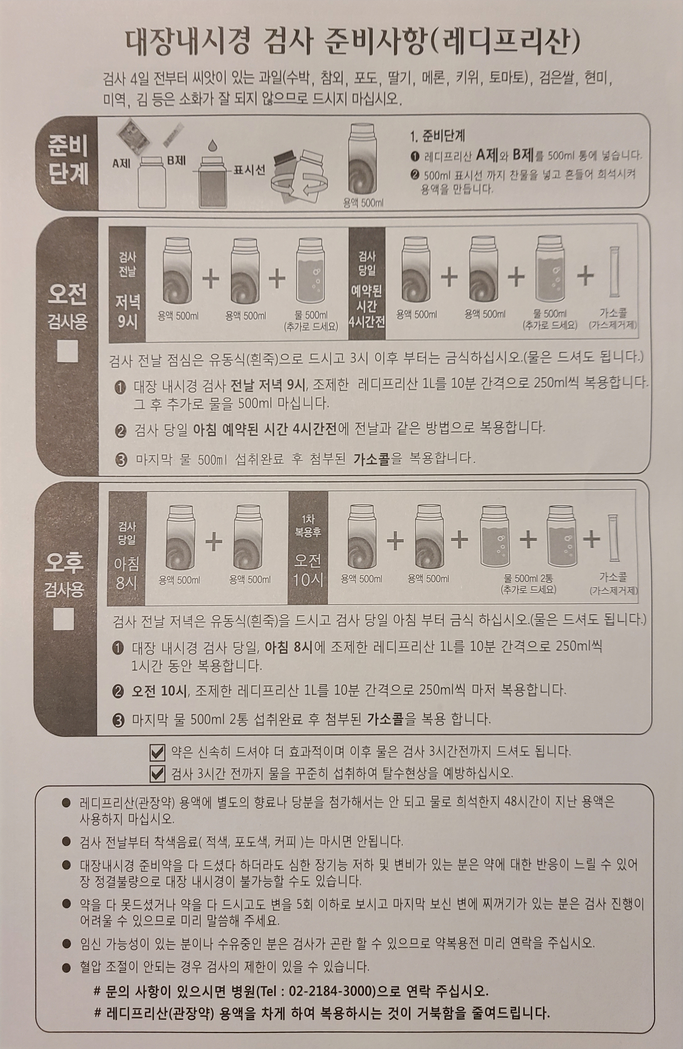 - 검사 전날: 김치, 시금치 등 야채류 피하고, 검사 전 저녁에는 흰 죽만 섭취