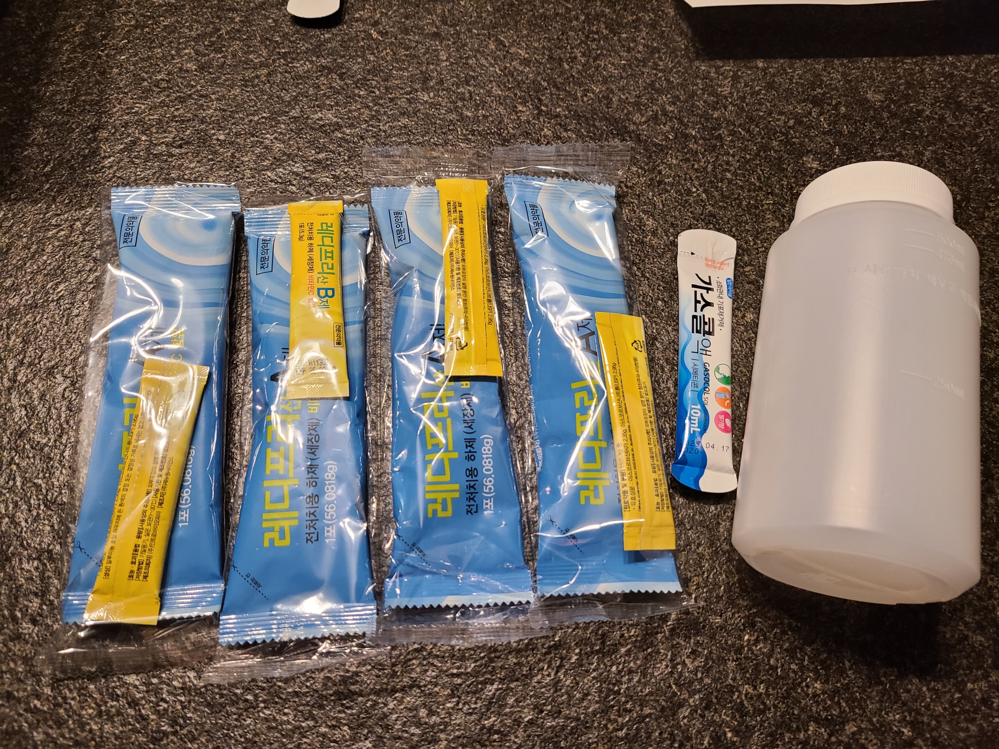 - 21시부터, 레디프리산 250ml씩 10분 간격으로 섭취합니다. 그리고 물을 500ml 추가로 마십니다. → 설사 타임
