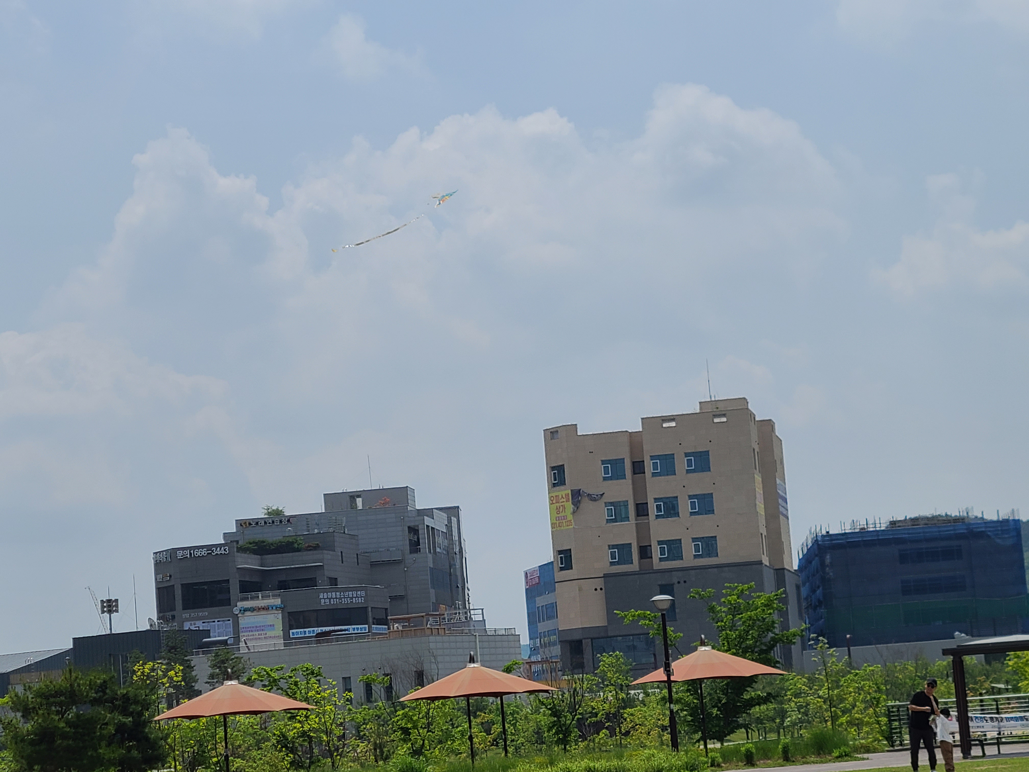 연을 날리는 아빠와 아들이 왔습니다. 저도 어렸을때 연을 많이 날렸던거 같은데 반갑네요. 바람이 적당히 불어서 아주 잘 납니다. 연 하나 사서 저도 날려보고 싶은 마음이 굴뚝같네요.