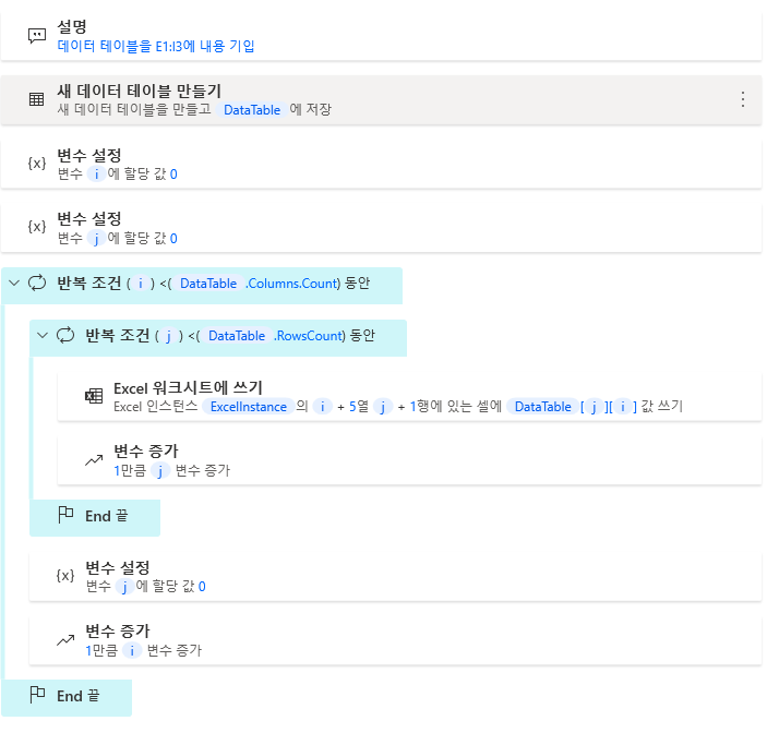 그래서 변수를 i뿐만 아니라 j도 필요해졌습니다. 변수i,j를 선언하고 초기값을 0으로 지정합니다. 그리고 조건 → 반복 조건을 Main흐름에 끌어서 중첩되게 배치합니다. 그럼 여기서 한가지 의문이 있을겁니다. 방금전 입력한 열의 개수는 5개이고, 행의 개수는 3개인데 우리는 이미 값을 입력하면서 행,열 개수가 몇개인지 아는 상황인데요. 중간에 값이 추가 되거나 삭제되었을 때 매번 Main흐름의 숫자를 바꿔줘야되는 불편함이 생깁니다. PAD에서는 이 부분을 친절하게도 현재 데이터 테이블의 행, 열의 개수를 알려주는 맴버변수를 제공해줍니다. 열의 개수는 DataTable.Columns.Count로 알 수 있고, 행의 개수는 DataTable.RowsCount로 알 수 있습니다. 아까 선언한 중첩 반복 조건에 이 값들만큼만 반복하도록 해주면 OK입니다.