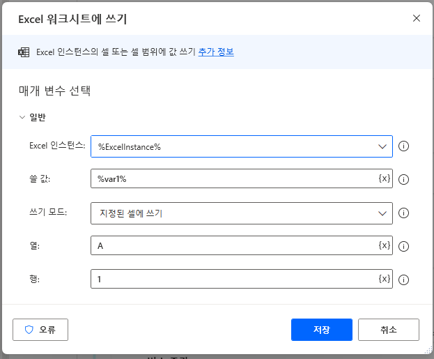 변수를 엑셀에 쓰기 위해서는 Excel → Excel 워크시트에 쓰기를 Main흐름에 넣고 어떤 값을 엑셀 어디 열,행에 쓸지 지정만하면 간단하게 기입이 됩니다. 여기까지는 아주 쉽게 이해하실수 있을겁니다!