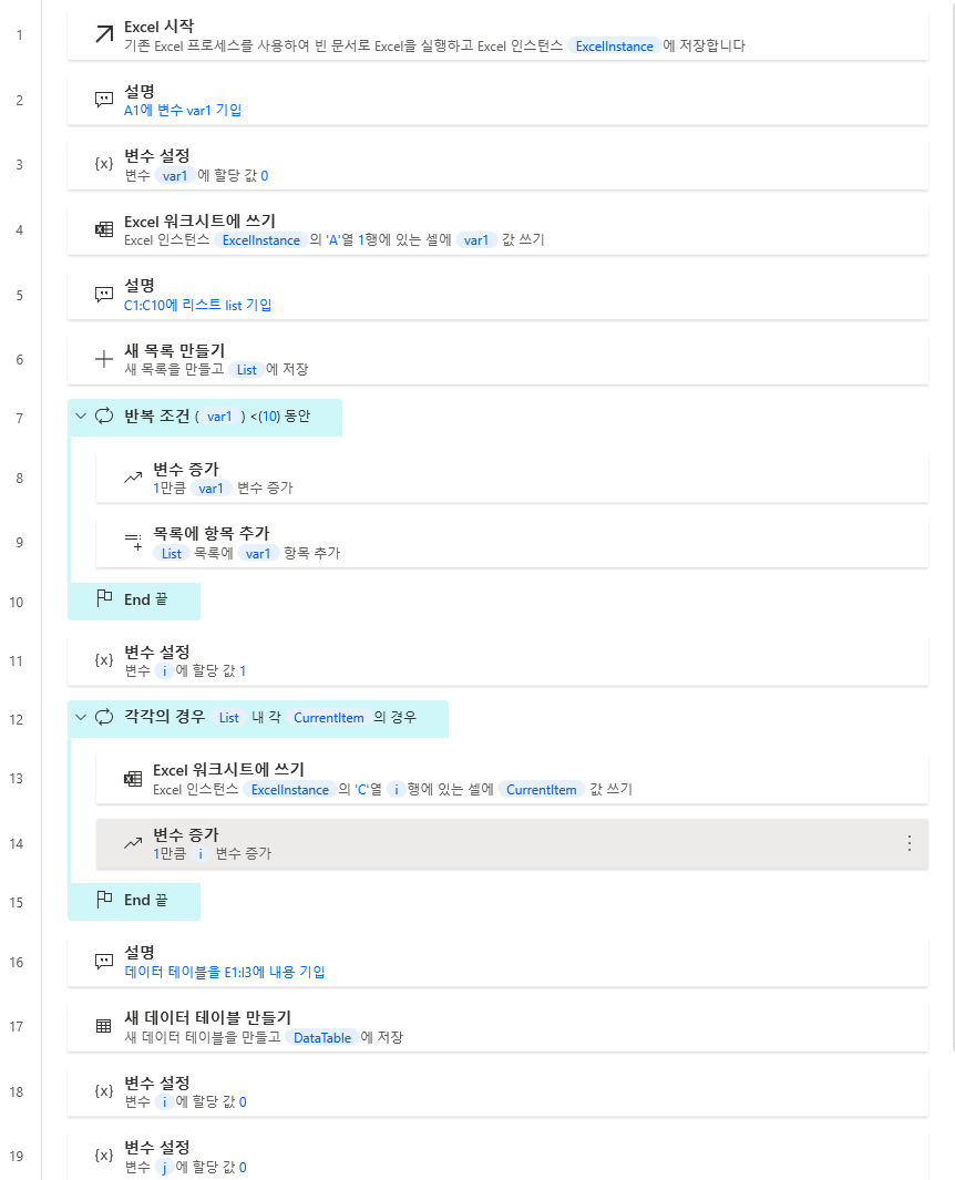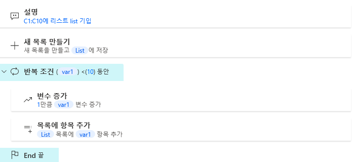 Excel 워크시트에 쓰기 상세 내용을 보면, 열은 C로 고정되어 있는데 행값은 변수i의 값으로 되어 있죠? 반복이 될때 i값이 1씩 증가하고 이 증가된 값이 C1, C2, C3의 형태로 표현이되는것입니다. 그러므로 Excel 워크시트에 쓰기는 딱 한번만 표현해도 모두 표현이 되는것입니다. 흐름수가 적어지니 직관적으로도 알아보기 쉽고 디버깅할때도 쉬워집니다. 여기까지가 목록에 대한 설명이였습니다.