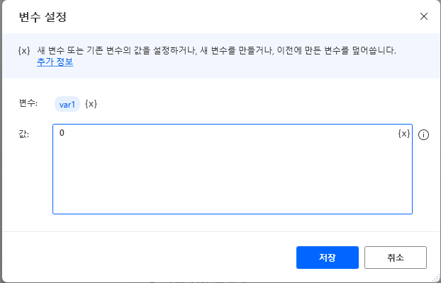 변수를 선언하고 초기화 하기위해서는 변수 → 변수 설정 메뉴를 끌어서 메인 흐름에 놓으면 아래와 같은 화면이 표시됩니다. 변수명은 기본값으로 Newvar인데요. 사용자가 임의로 변수명을 변경할 수 있습니다. 저는 var1으로 변수명을 지정하고 초기값을 '0'하였습니다.