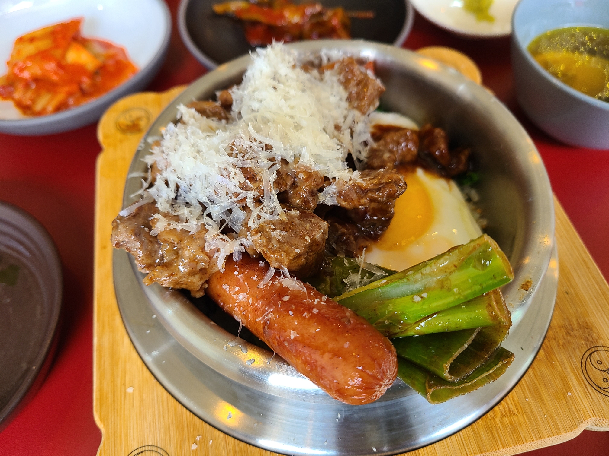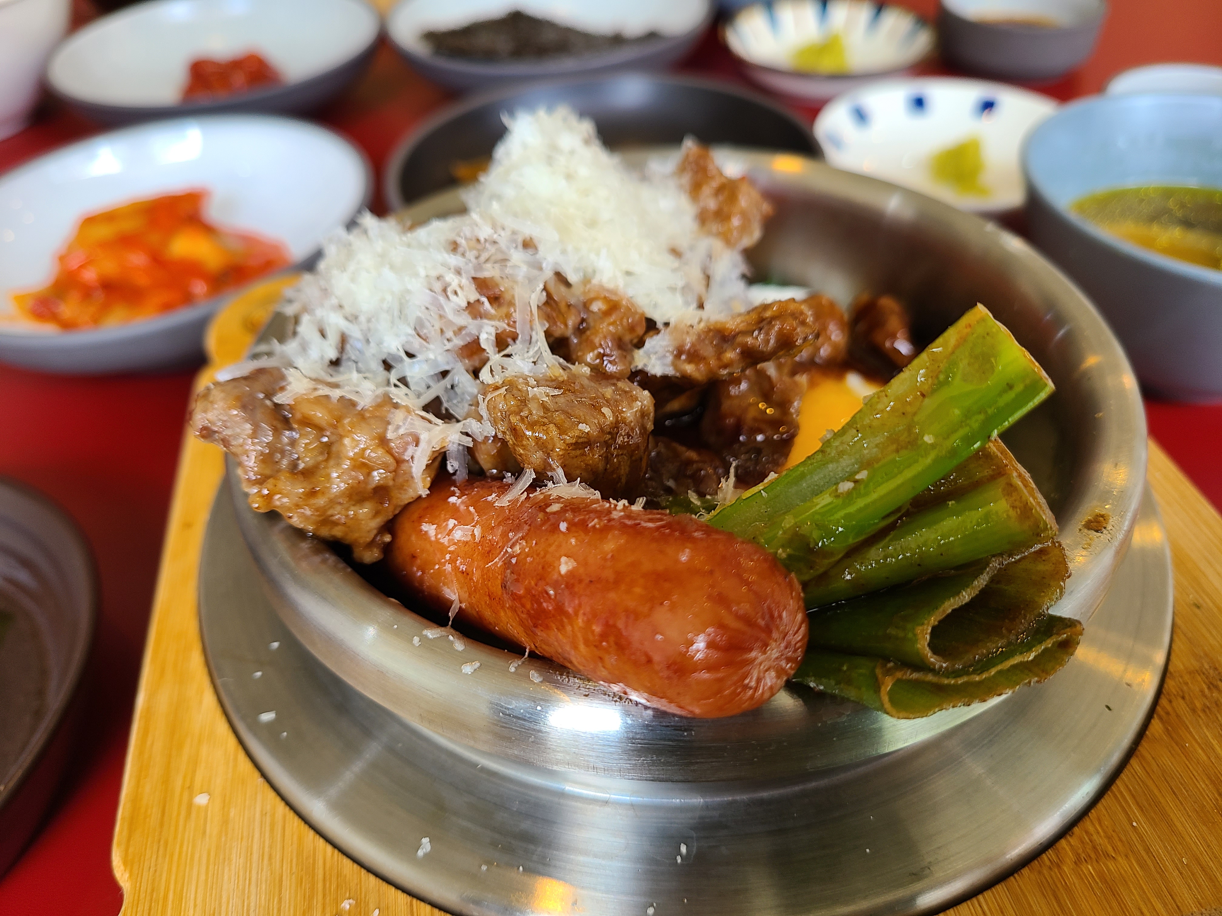 7. 메인요리가 나왔다. 솥언에 밥, 고기, 소시지, 계란 등 한가득 들어있었다. 보기만해도 푸짐한 느낌^^