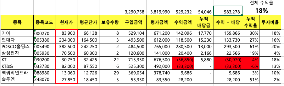 이전 경험을 비추어 볼때 기아 자동차도 계속 물타기해서 보유수량이 꽤 됐거든요. 지금와서 보면 누적 수익률이 30%된거 보면, KT, KT&G도 기아처럼 효자종목이 될거라고 믿어 의심치 않습니다. 기본적으로 통신망, 담배 사업은 망할수가 없잖아요! 이런 믿음을 가지고 플러스가 될때까지 물을 타보겠습니다.