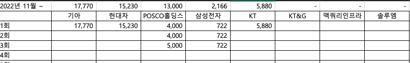 | 1. 한달에 25만원만 투자할 수 있음. - 배당주 위주로 투자 - 투자한 종목 중 마이너스가 난 것 부터 추가 매수함. - 현재 저평가로 되어 있는것 위주로 매수 |