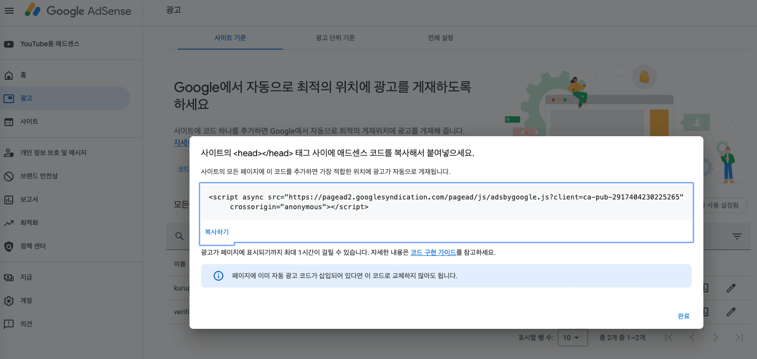 2. google adsense 사이트 방문 > 광고 > 코드 가져오기
