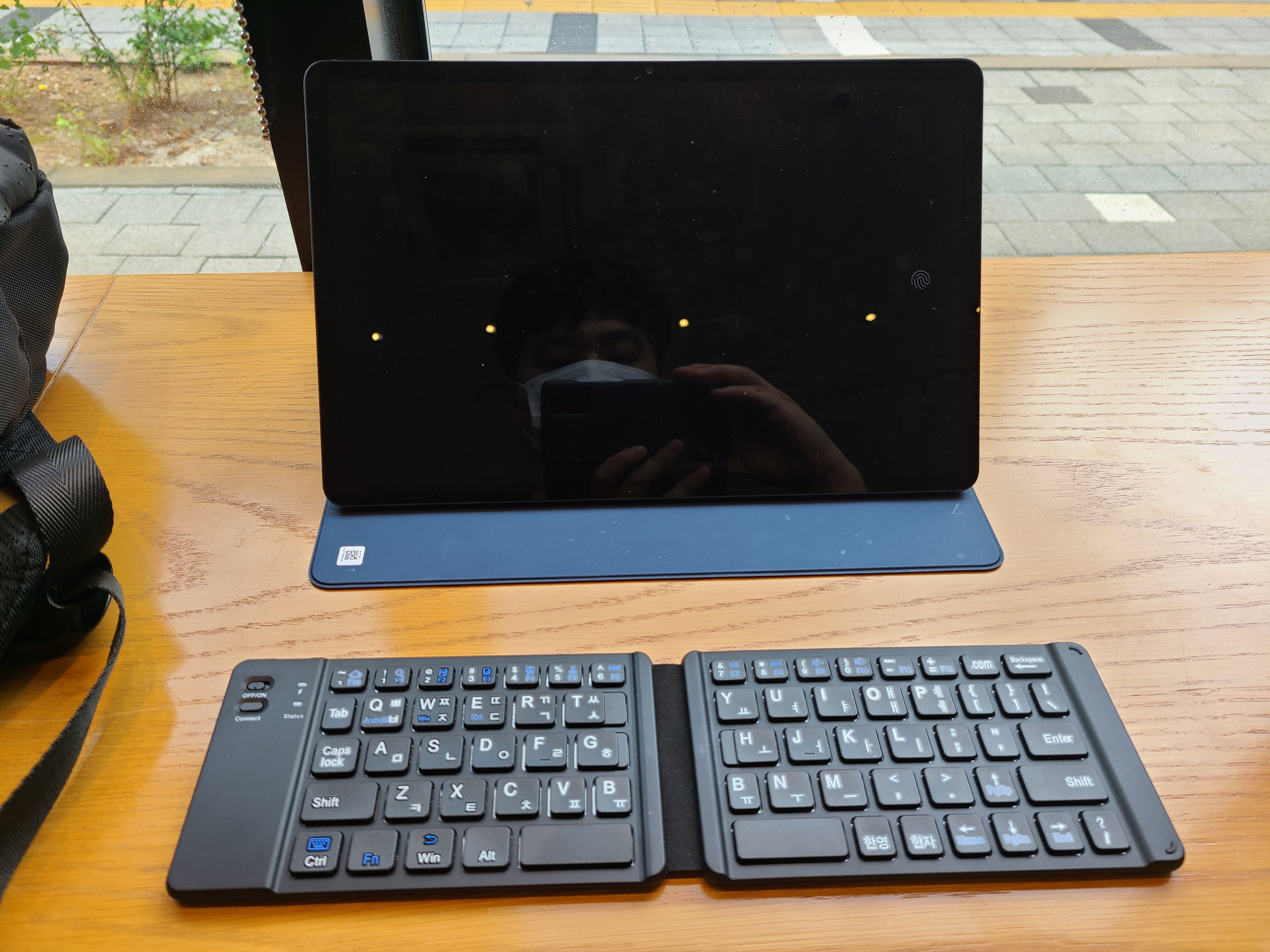 이게 접이식 키보드다 보니까 가볍고 특히 갤럭시 탭 북커버랑 딱 어울리는거 같아요. 화면이 멀리있어도 블루투스니까 칠수 있는게 목관절 건강에도 유리한것 같아요. 게다가 깔 맞춤도 된것 같아서 기분이 좋아요.