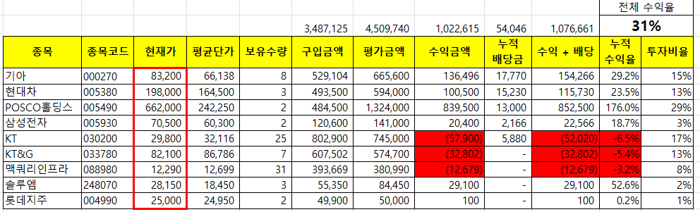 | 1. 한달에 25만원만 투자할 수 있음. - 배당주 위주로 투자 - 투자한 종목 중 마이너스가 난 것 부터 추가 매수함. - 현재 저평가로 되어 있는것 위주로 매수 |