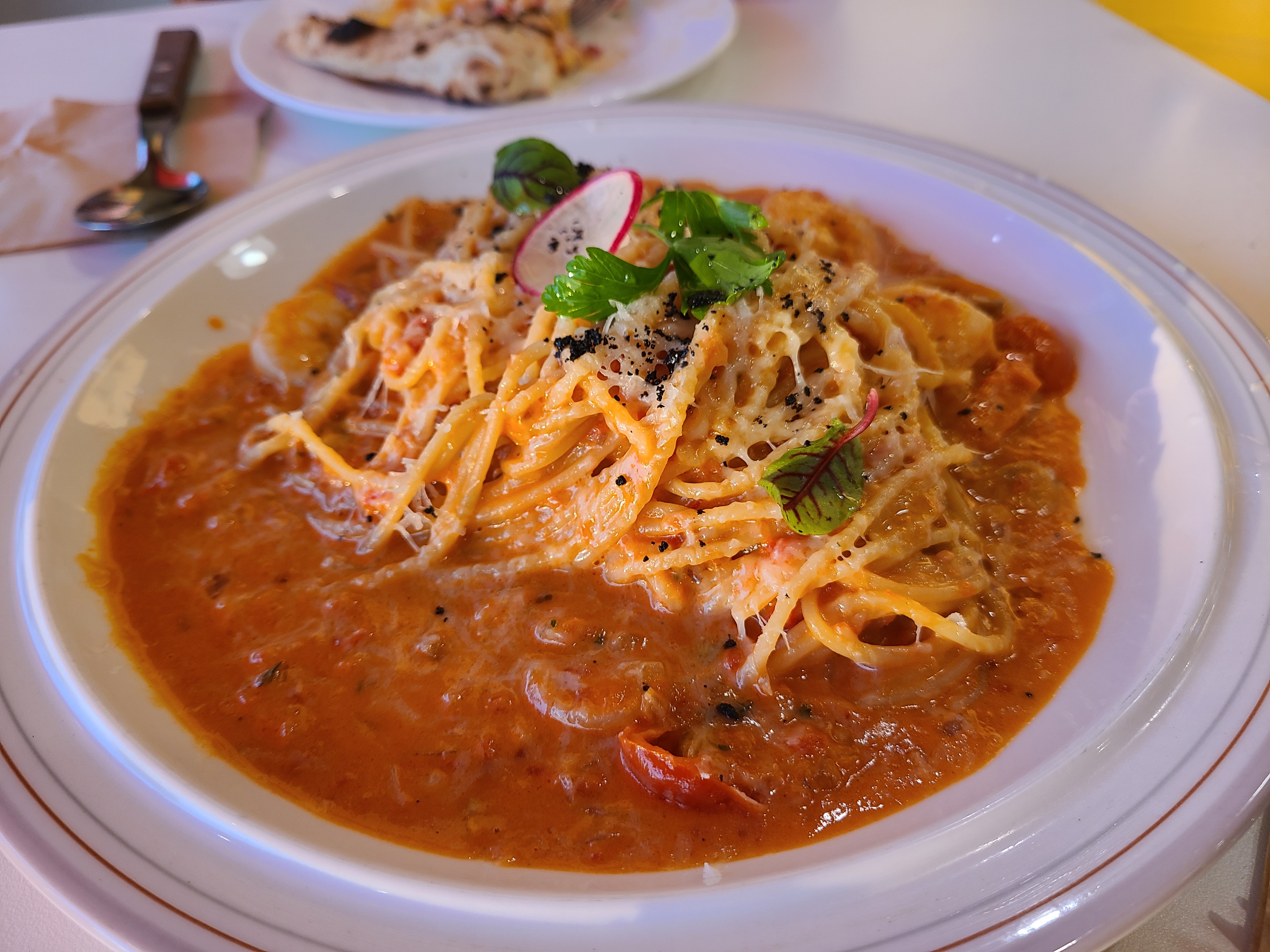 6. 로제 파스타가 나왔는데 피자 도우 남은 부분을 파스타 소스에 찍먹하니 이것도 일품이더군요. 파스타는 왕새우가 듬뿍 들어가서 식감도 좋았네요.