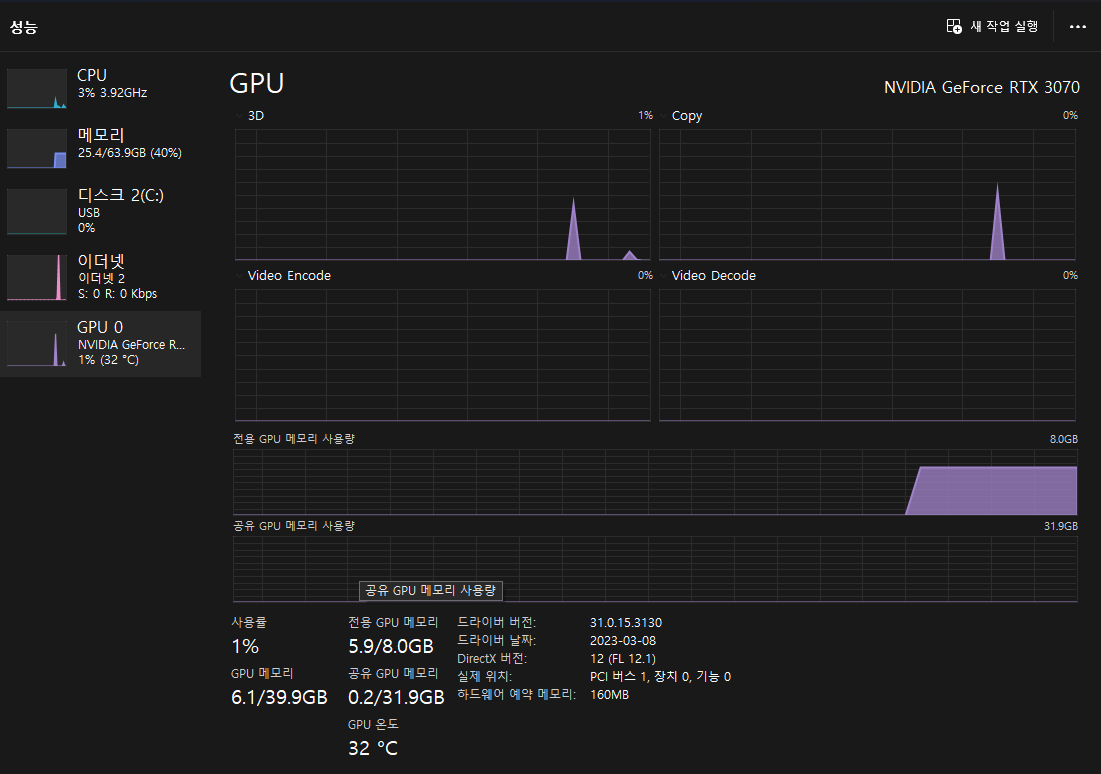 질답을 끝내고 얼마나 자원을 사용했는지 확인해보았는데, 아직...VRAM이 2GB 정도 여유 있는것을 확인할 수 있었습니다. 하지만 불안 불안 합니다.ㅠㅠ