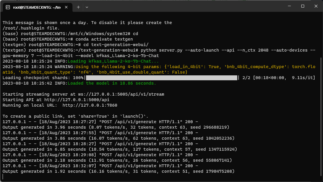 python server.py --auto-launch --api --n_ctx 2048 --auto-devices --gpu-memory 7 --load-in-4bit --model kfkas_Llama-2-ko-7b-Chat