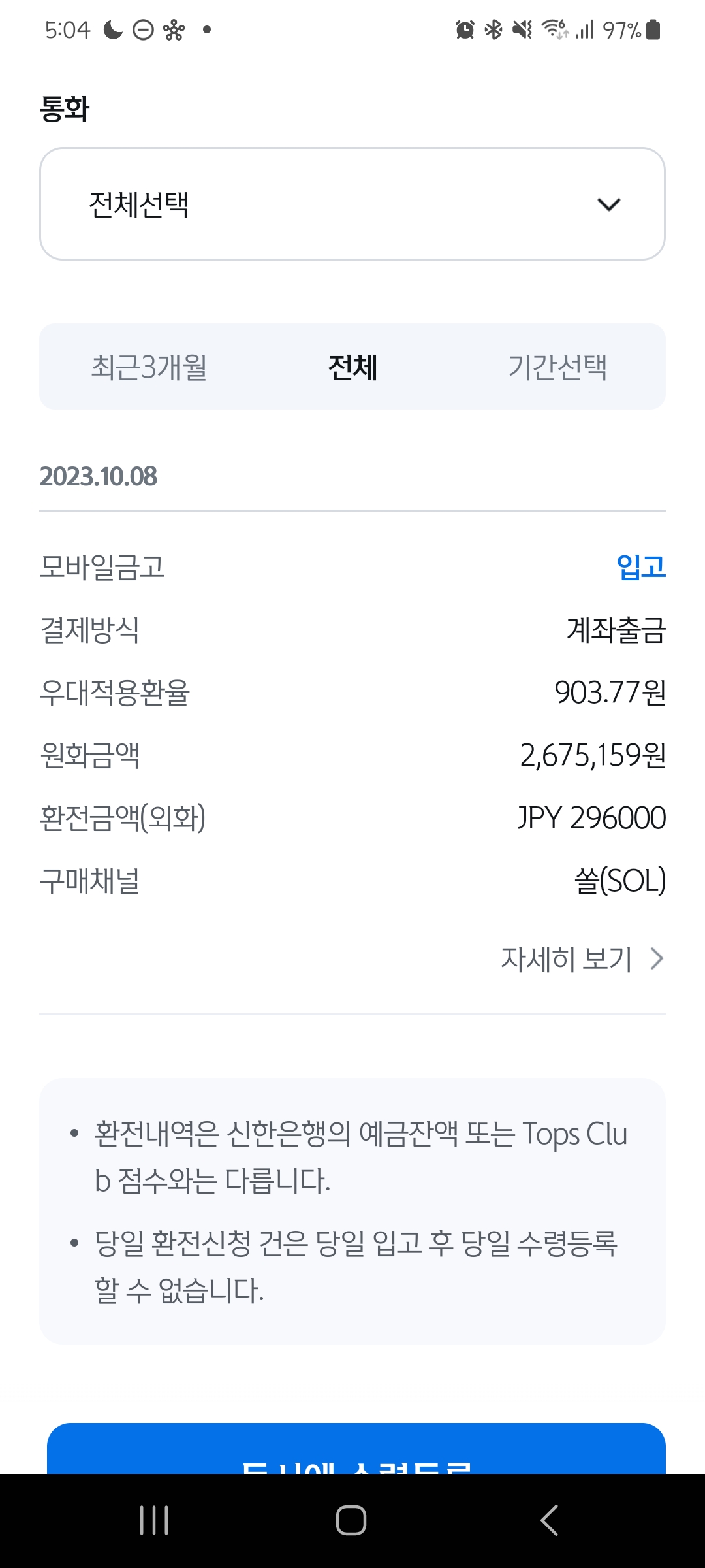 입금은 KRW로 USD기준 1일 $2,000까지 최대 $10,000까지 할 수 있습니다.(엔화 환전 시 자동으로 USD 제한까지 보여줌) 저는 296,000엔 정도 환전 신청했습니다. 일본 여행을 3박 4일 정도 생각하고 있기 때문에 이정도면 충분하지 않을까 생각이 됩니다.