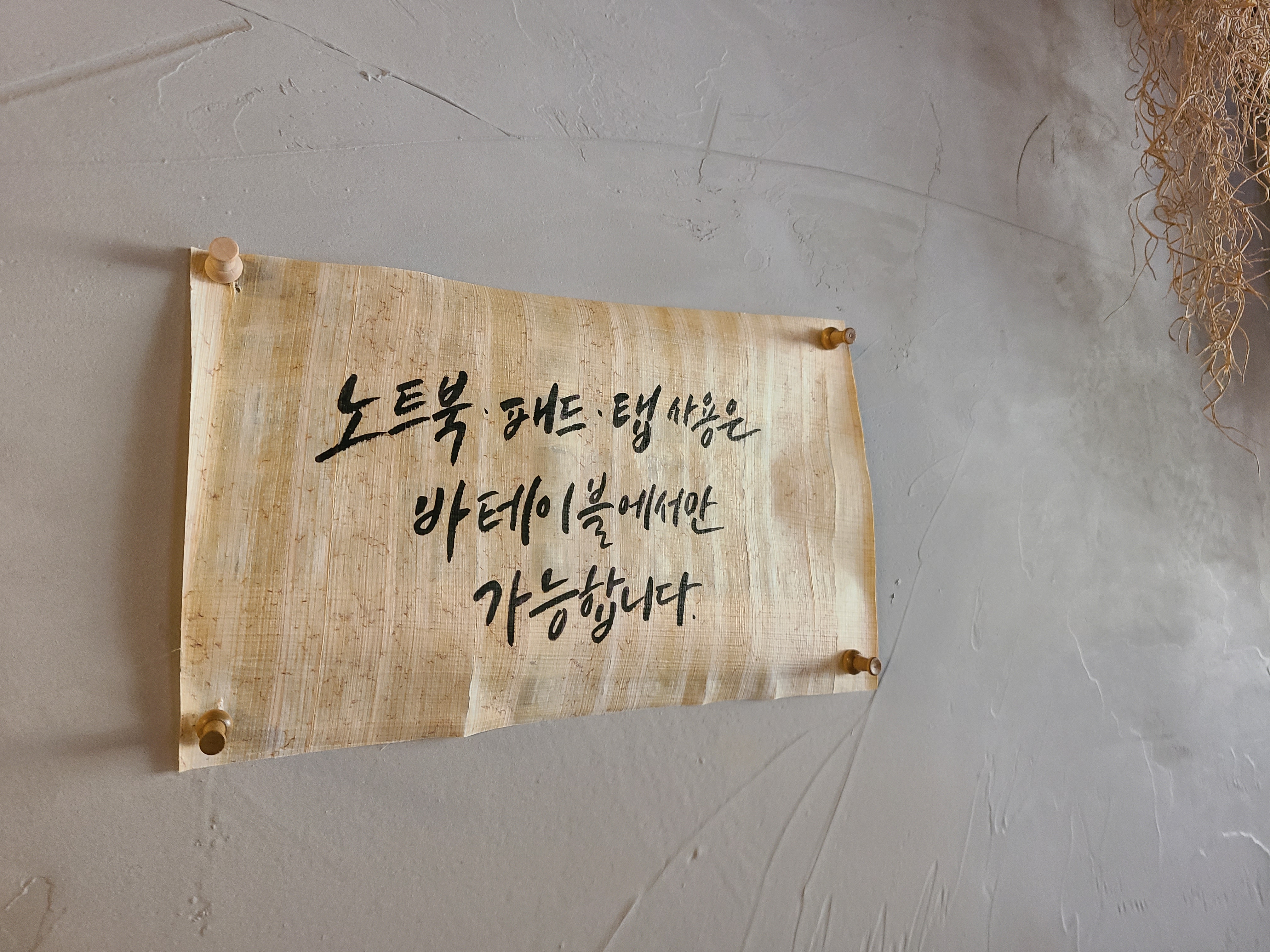 3. 이런 감성적인 카페에서 하루종일 죽치고 공부하는 분들이 많았는지 테이블 자리에서는 노트북, 패드, 탭 사용은 금지되었습니다. 창가쪽에 있는 바자리에서만 사용해야합니다.