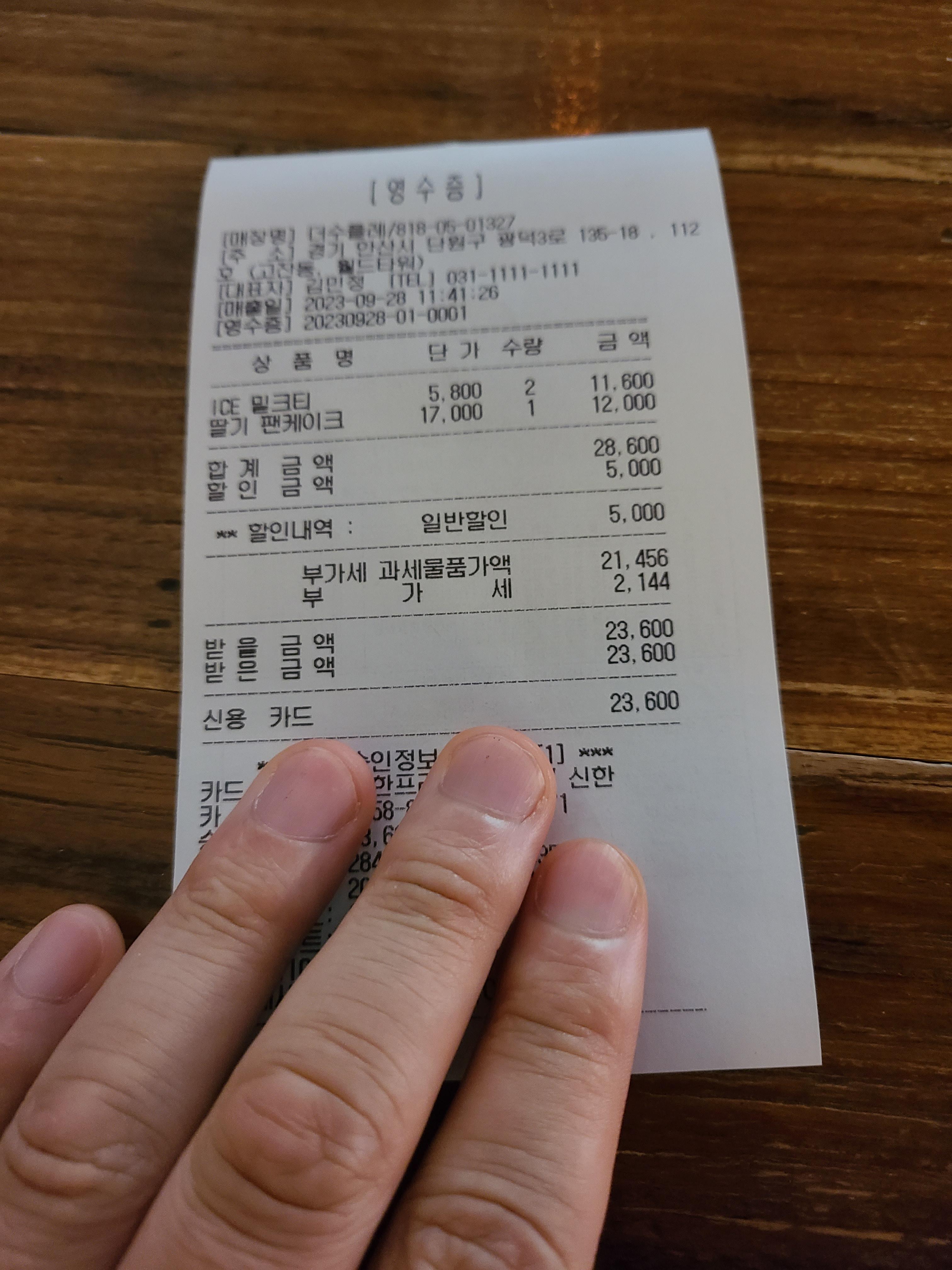 4. 주문한 아이스 밀크티와 딸기 팬케이크가 나왔습니다. 원래 그냥 팬케이크만 시켰는데 오픈이 늦어져서 죄송하다고 5천원 할인을 해주시는 바람에 딸리 팬케이크로 업그레이드 했네요. ㅋㅋ