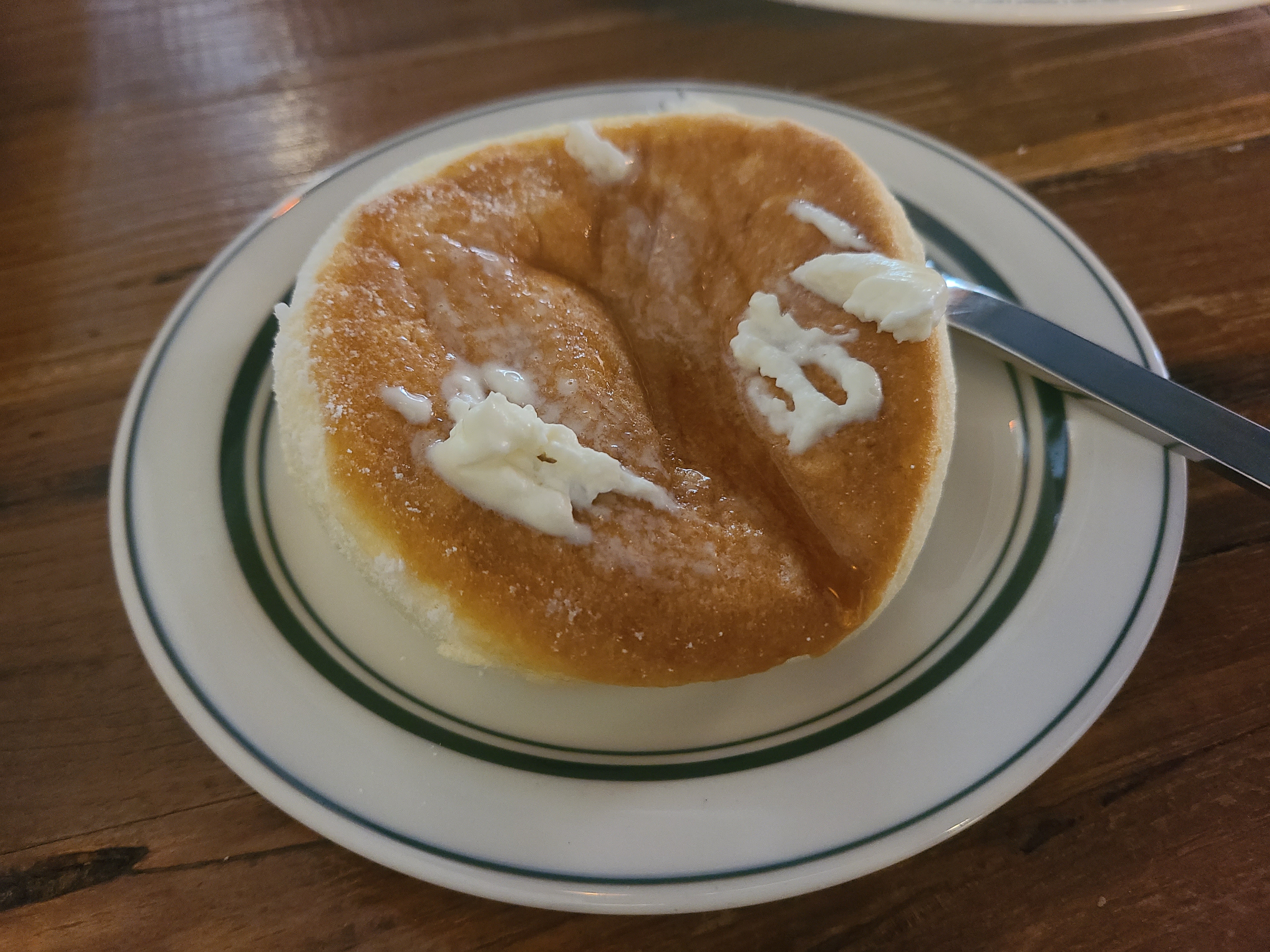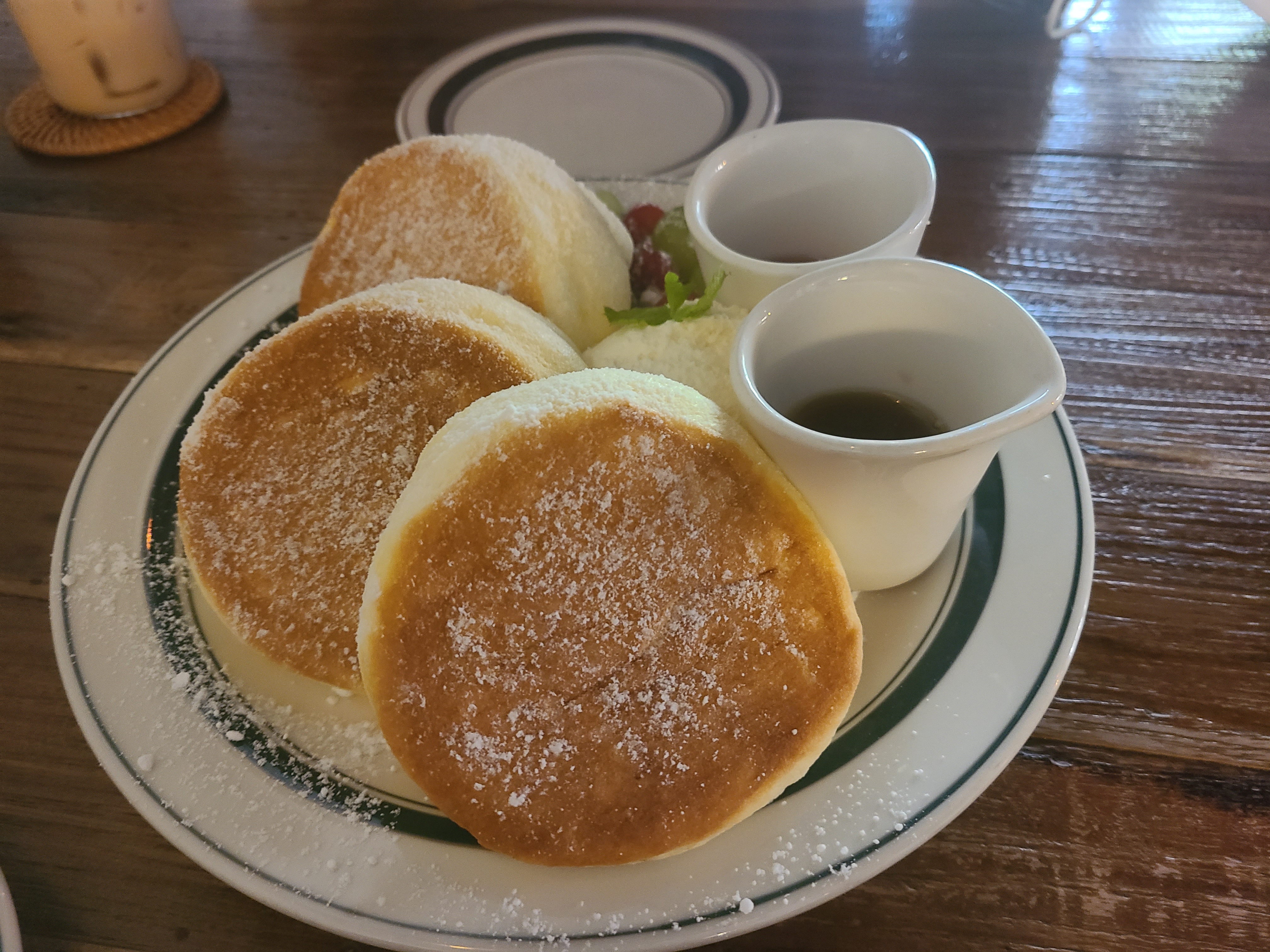 5. 팬케이크는 계란빵 느낌이 물씬 풍겼습니다. 엄청난 뽕이 들어간거 같은 ㅋㅋ 보기엔 커보여도 압축 시키면 양은 얼마 되지 않습니다. 하지만 감성은 충만합니다. 시럽도 바르고 ㅇㅇ도 발라서 먹으니 정말 맛있더군요^^