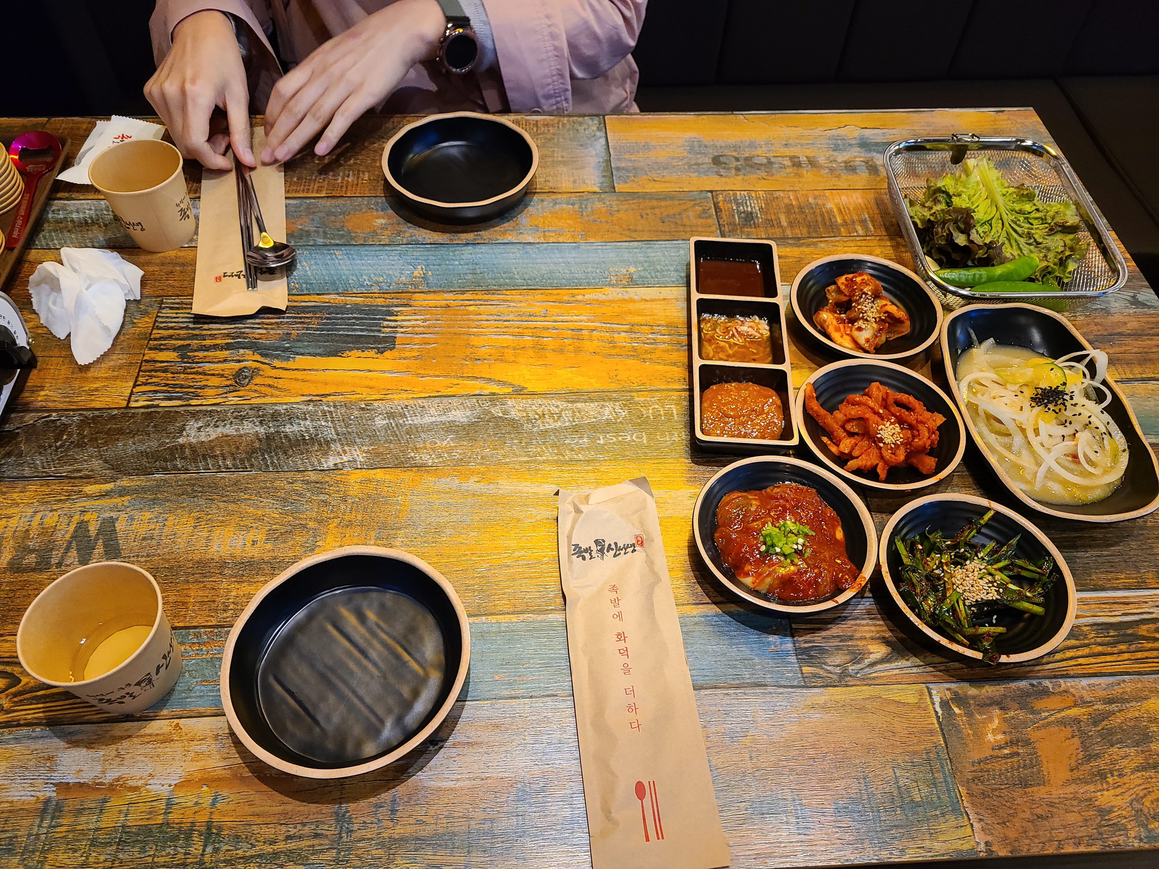 4. 족발이 나오기 전에 밑반찬이 깔리고 막국수, 순두부찌개가 먼저 등판했습니다. 밑반찬 중에서 굴젓이랑 부추가 맛있습니다. 김치는 약간 첨 느끼는 향기(?)가 나서 하나 먹고 먹진 않았습니다. 약간 향신료가 들어간거 같았어요. 보통의 김치는 아닌듯.