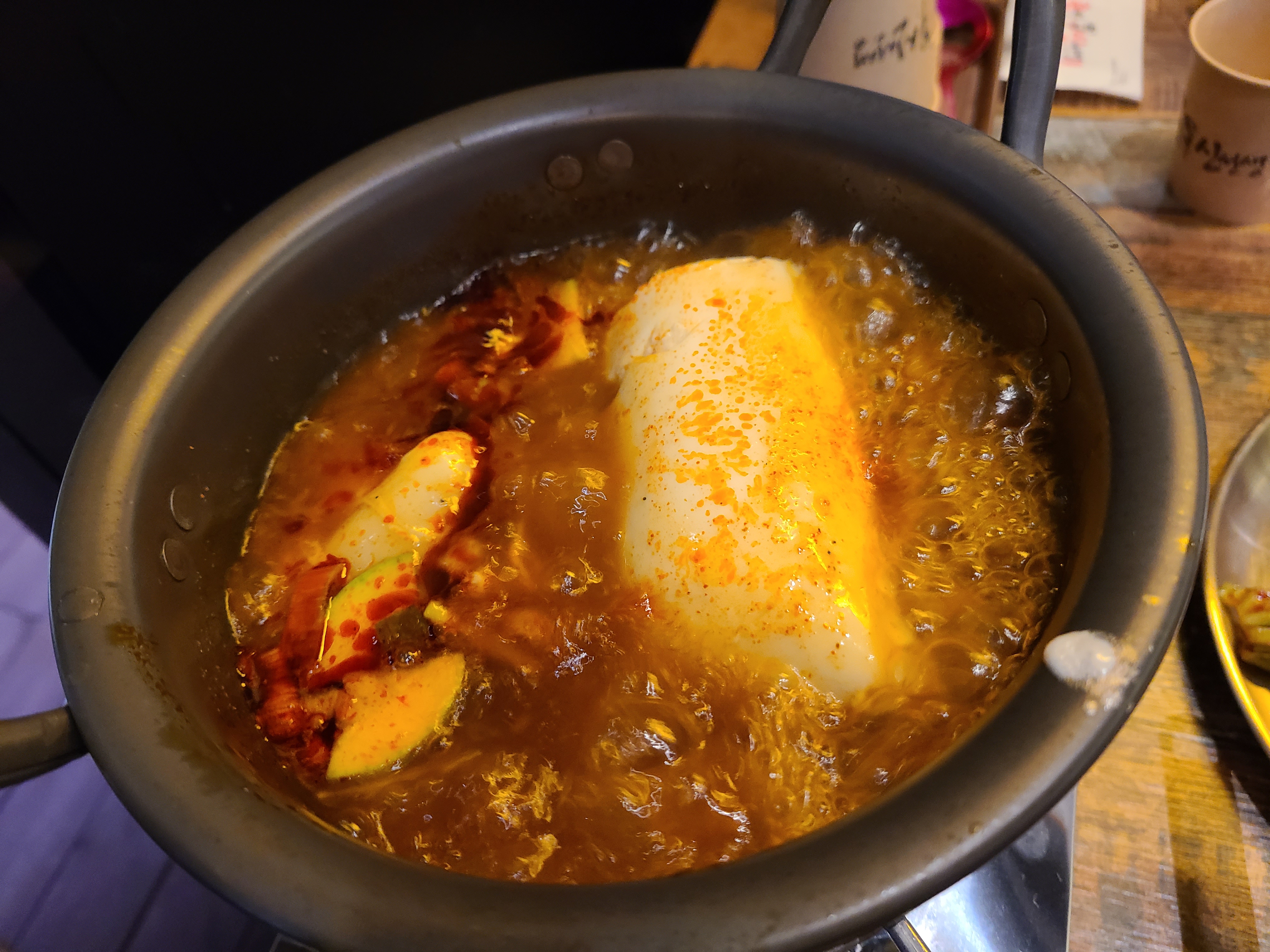 6. 순두부찌개도 즉석에서 해 먹는거라 좋더군요. 순두부를 숟가락으로 잘게 자른다음 계란을 넣고 끓여주면 완성. 순두부에 간에 베이게 많이 끊여주는게 포인트입니다. 라면 국물같이 좀 구수한게 좋았어요.