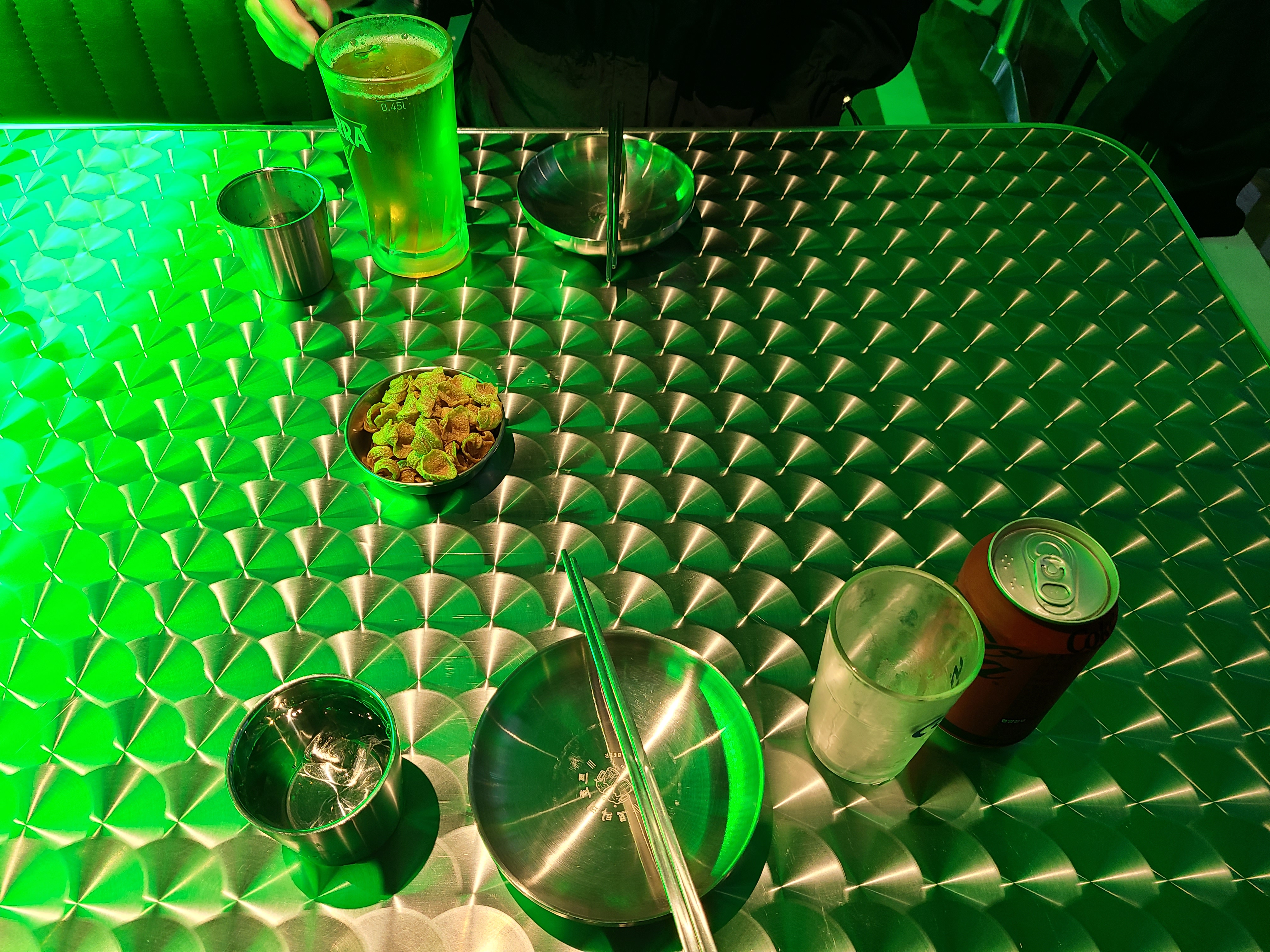 2. 밥상과 의자는 철로 되어 있습니다. 그래서 그런지 초록색 반사가 더욱 잘되는 현상도 만들어집니다. 진짜 초록색에 미친(좋은 의미로) 가게였습니다.