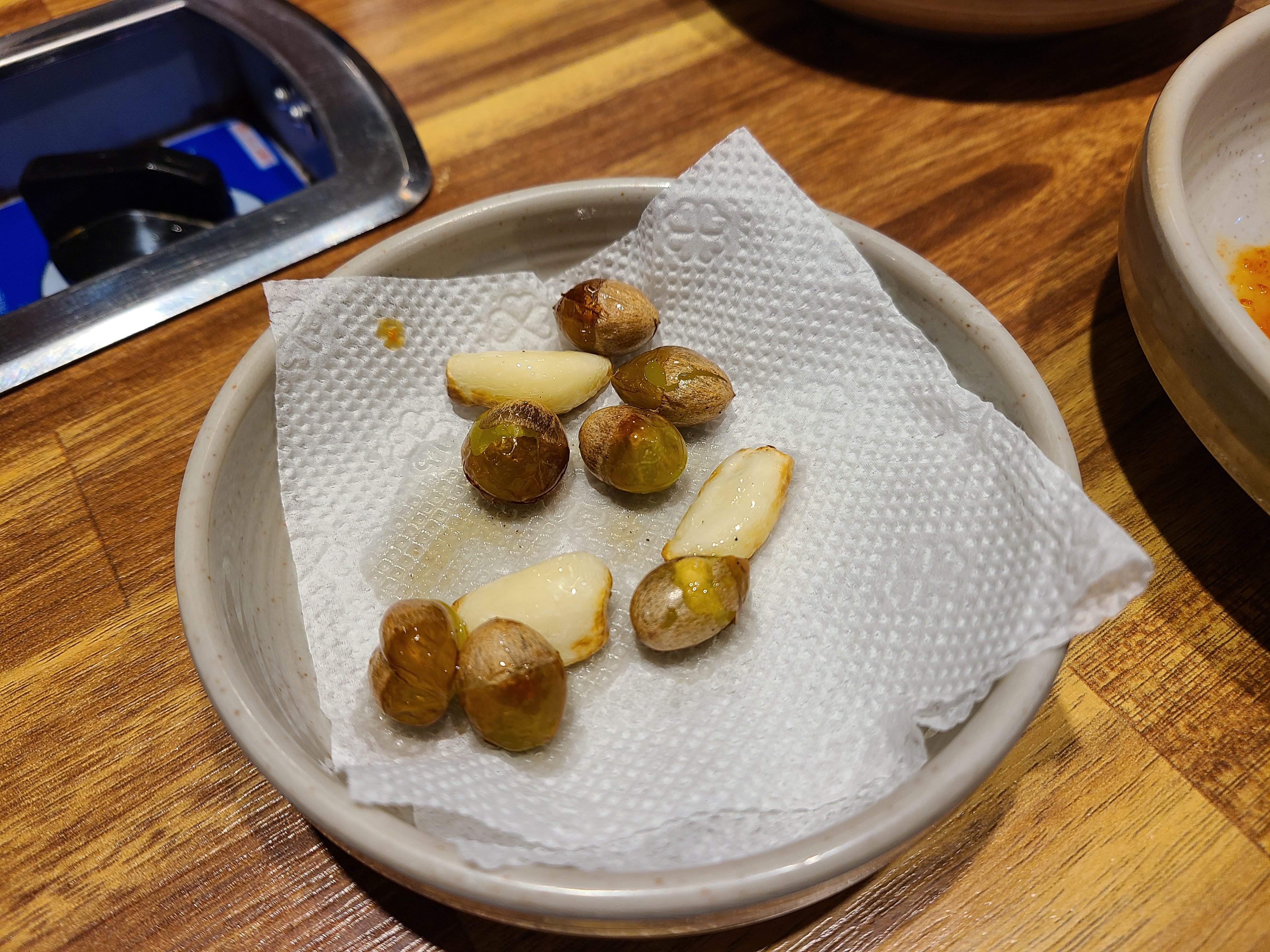 3. 기본반찬 세팅되고 좀 지나서 은행이랑 마늘 볶은것을 주시더라고요. 껍질을 까고 소금에 살짝 찍어먹으니 별미더군요 ㅎㅎ