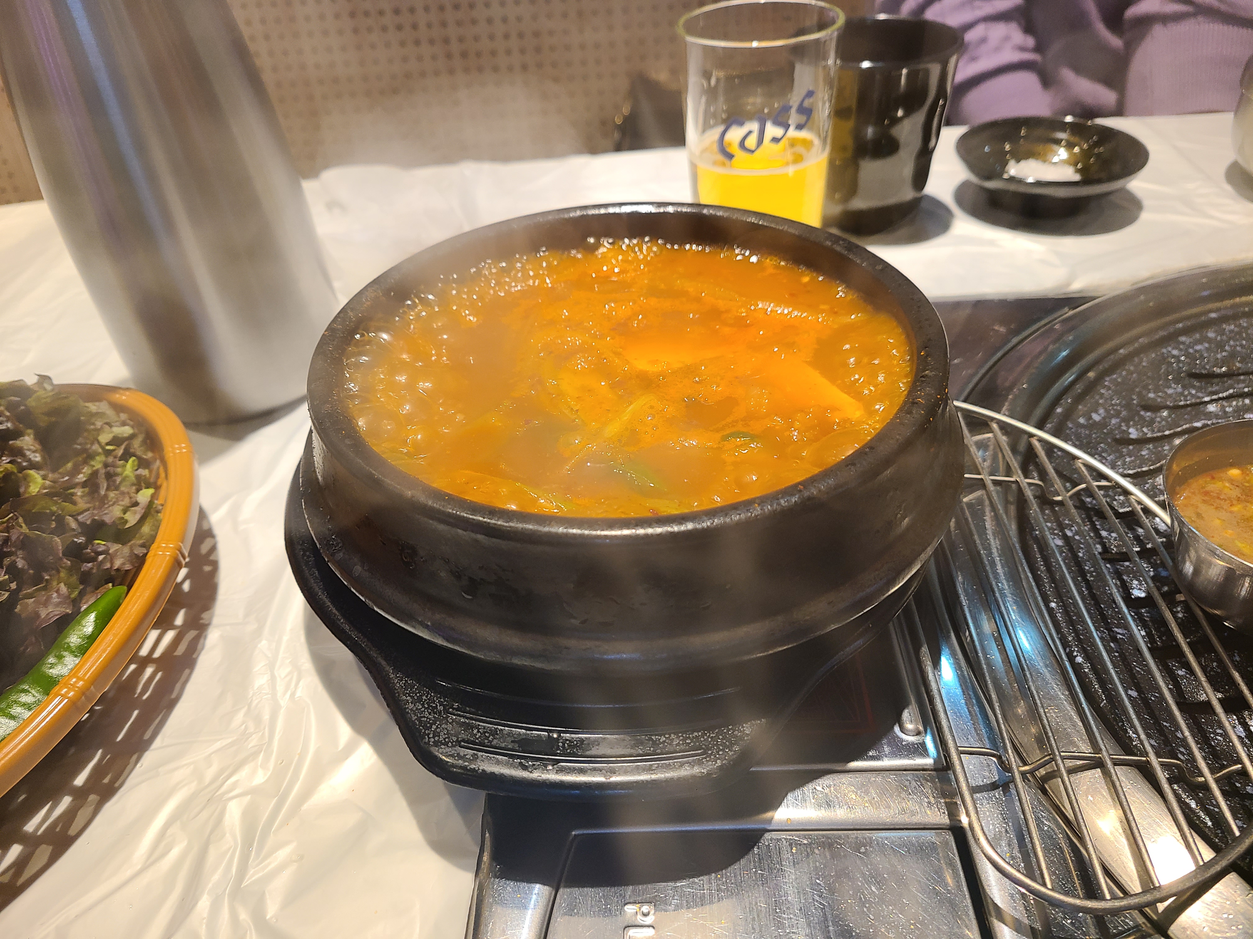 2. 불판 덮개가 메뉴판입니다. 한우는 너무 비싸서 만만한 한돈 오겹살을 주문했습니다. 그리고 김치찌개(공깃밥 1개 포함)랑 공깃밥 1개를 추가했습니다.