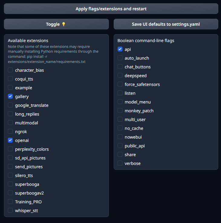 Boolean command-line flags에 api를 체크하고 위의 openai를 체크한 다음 [Apply flags/extensions and restart]를 누르면 활성화 됩니다.
