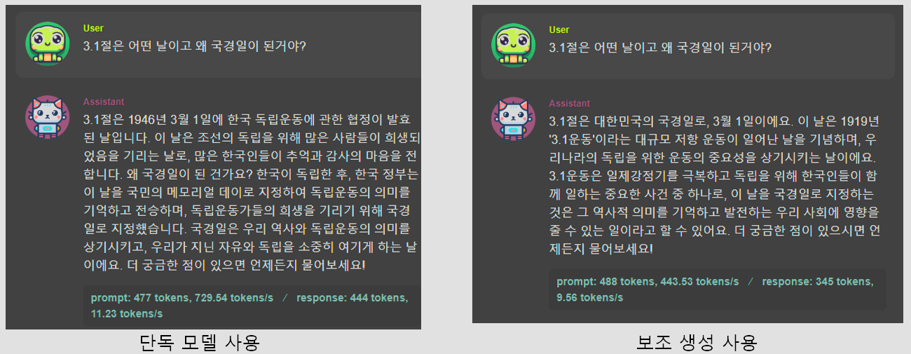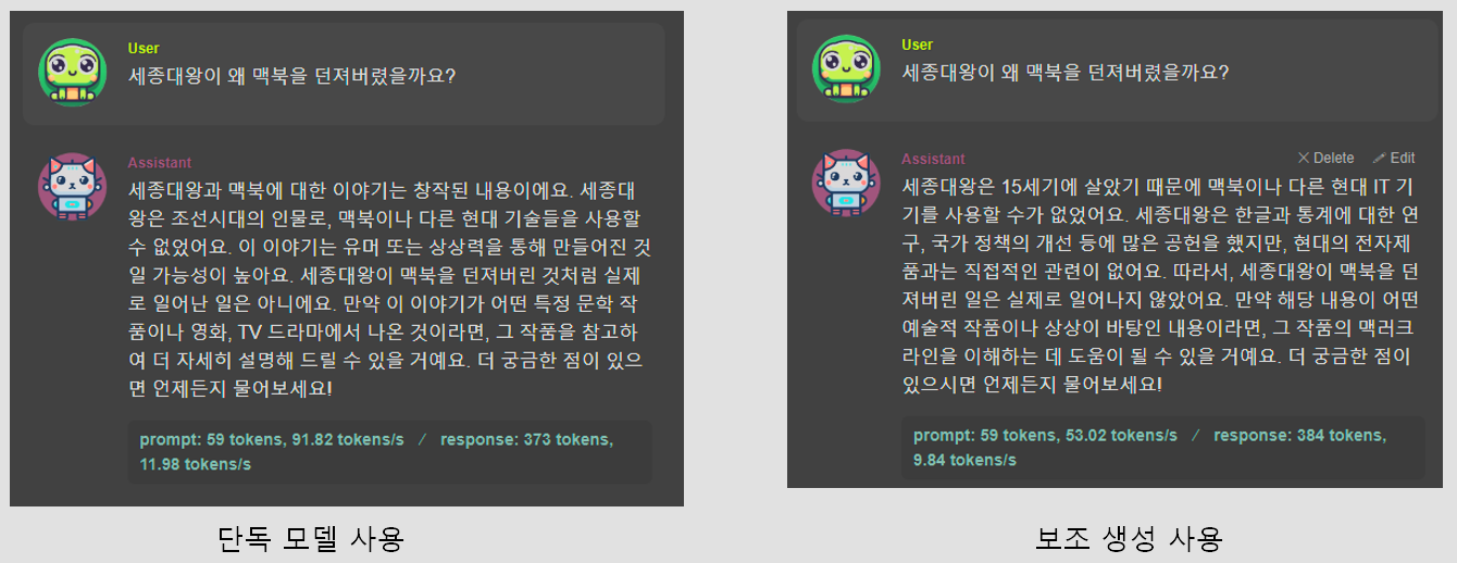메인모델 단독으로 돌렸을 때 초당생성토큰과 메인+보조 조합으로 했을 때의 속도를 비교해보았습니다. 이론과는 다르게 오히려 속도가 떨어지는 결과를 낳았습니다. 이론과는 달라서 조금 당황스럽네요.