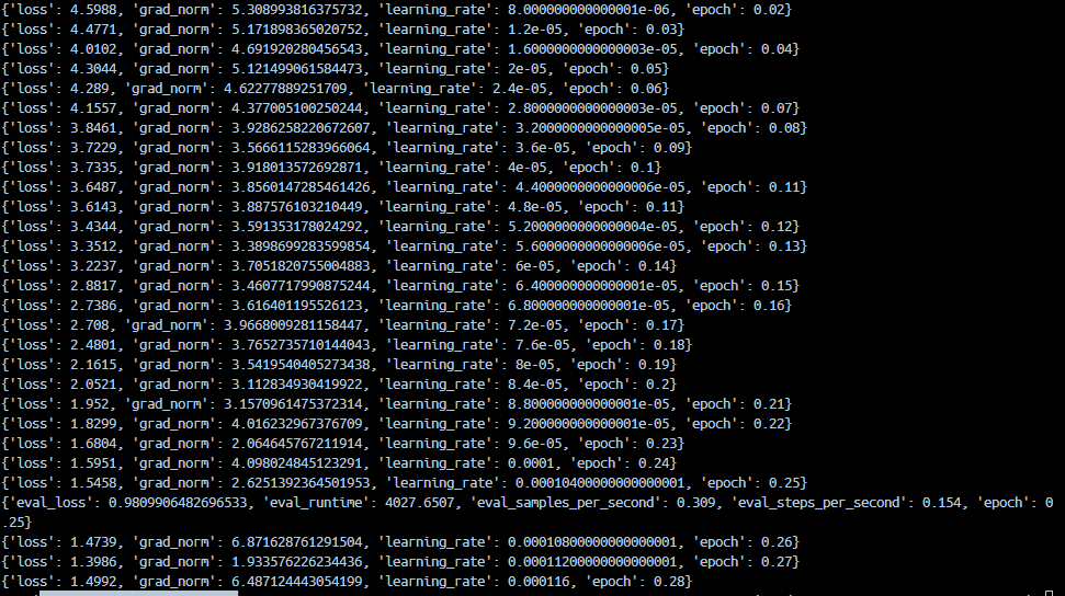 ■ eval_loss: 평가 데이터셋에 대한 손실 값입니다. 일반적으로 이 값은 모델의 성능을 나타냅니다. 낮은 평가 손실은 모델이 평가 데이터에서 더 정확한 예측을 수행한다는 것을 의미할 수 있습니다.