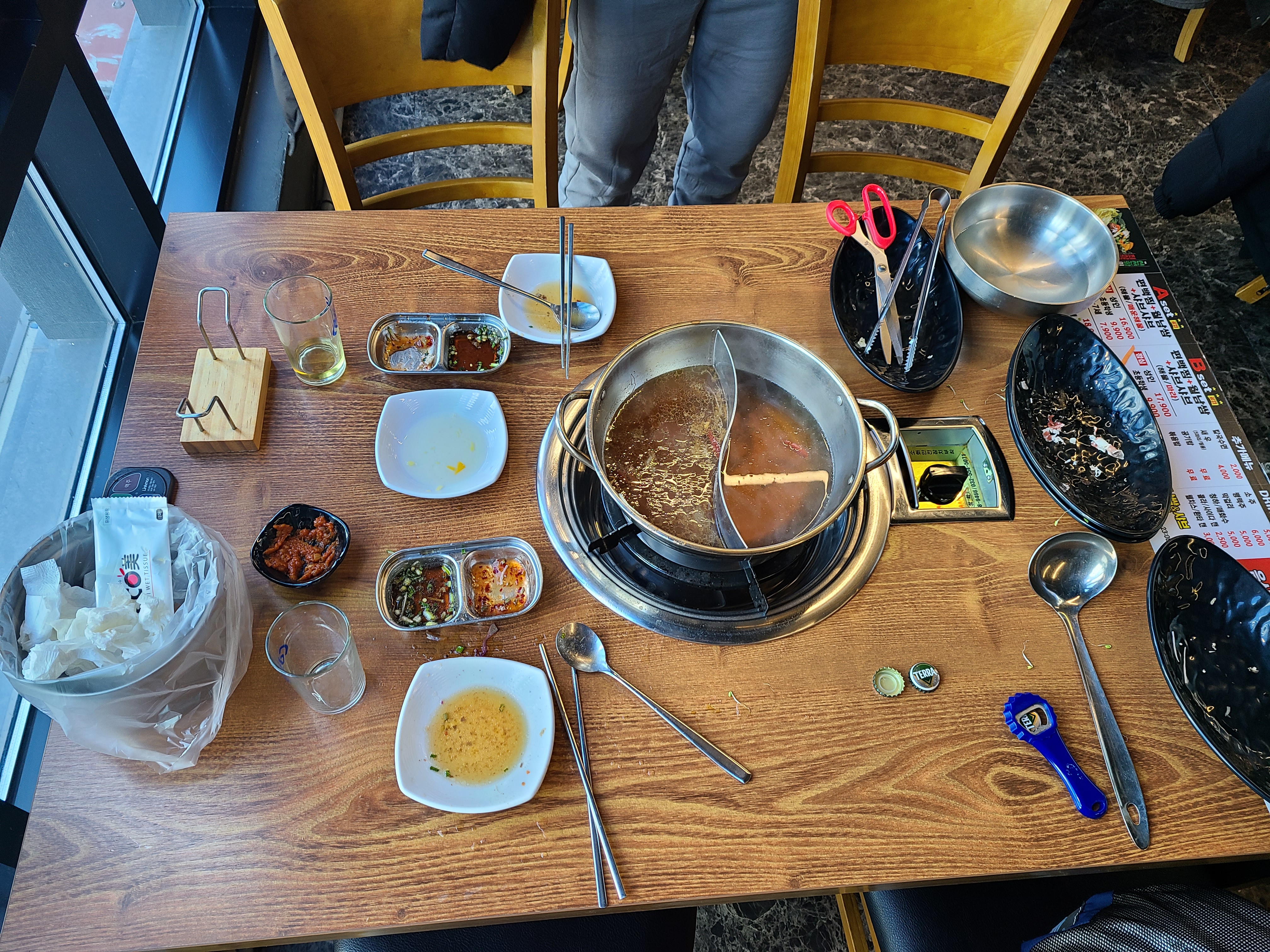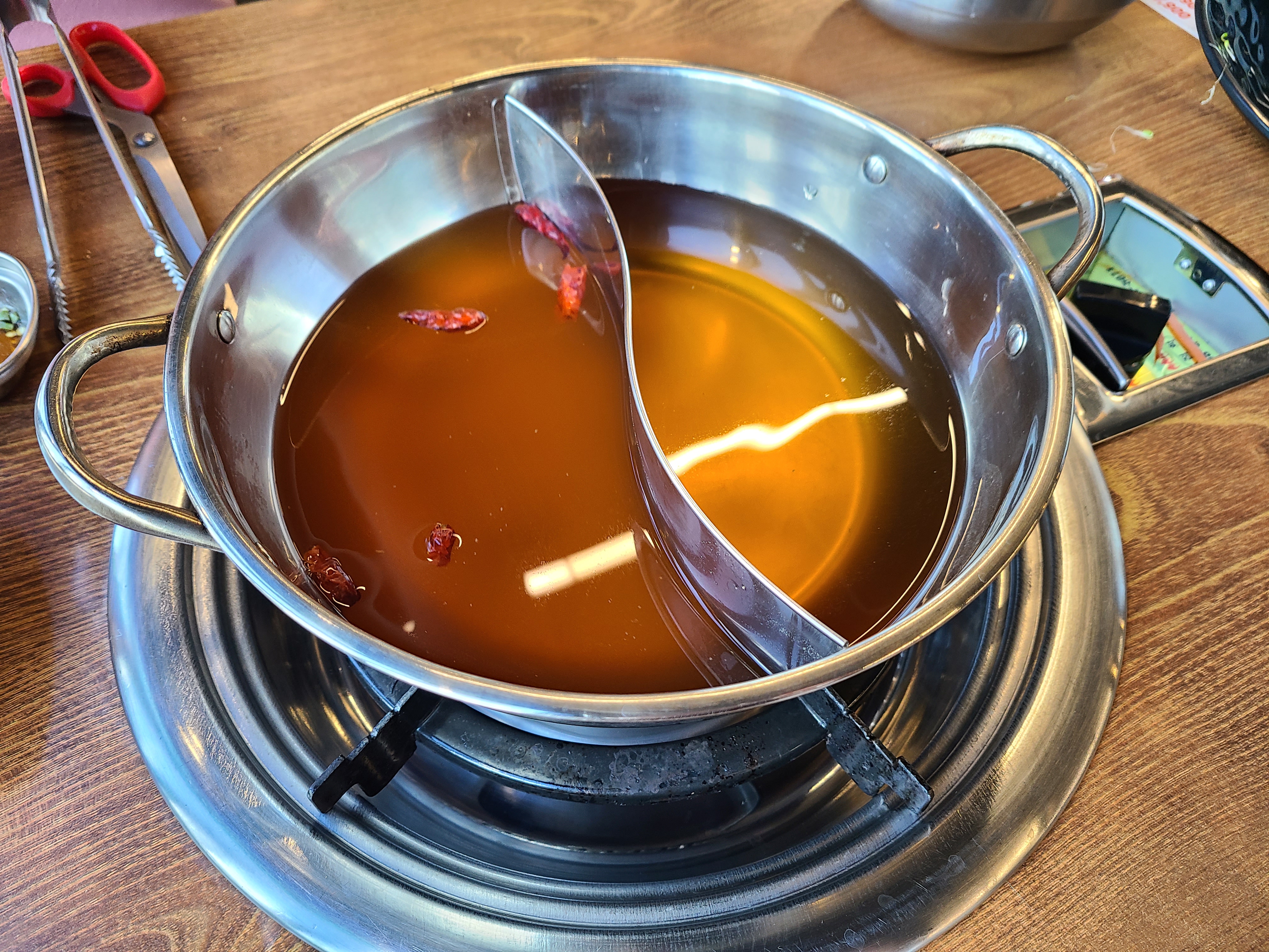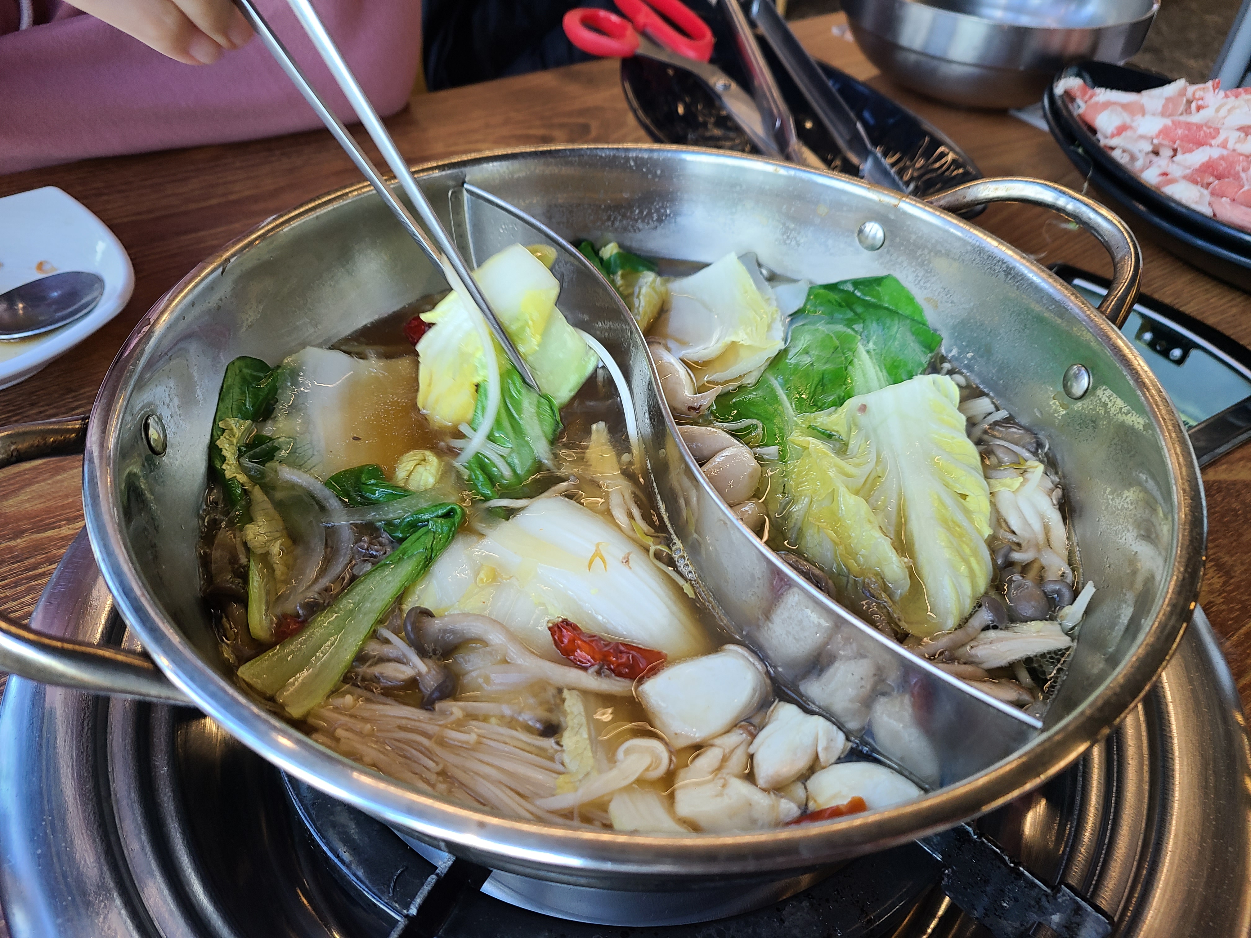 8. 마지막은 샤브샤브인데 국물이 매운거랑 안매운거 2가지 형태로 나옵니다. 와이프랑 저 둘다 매운쪽이 맛있어서 여기다가 샤브샤브 해먹었어요.