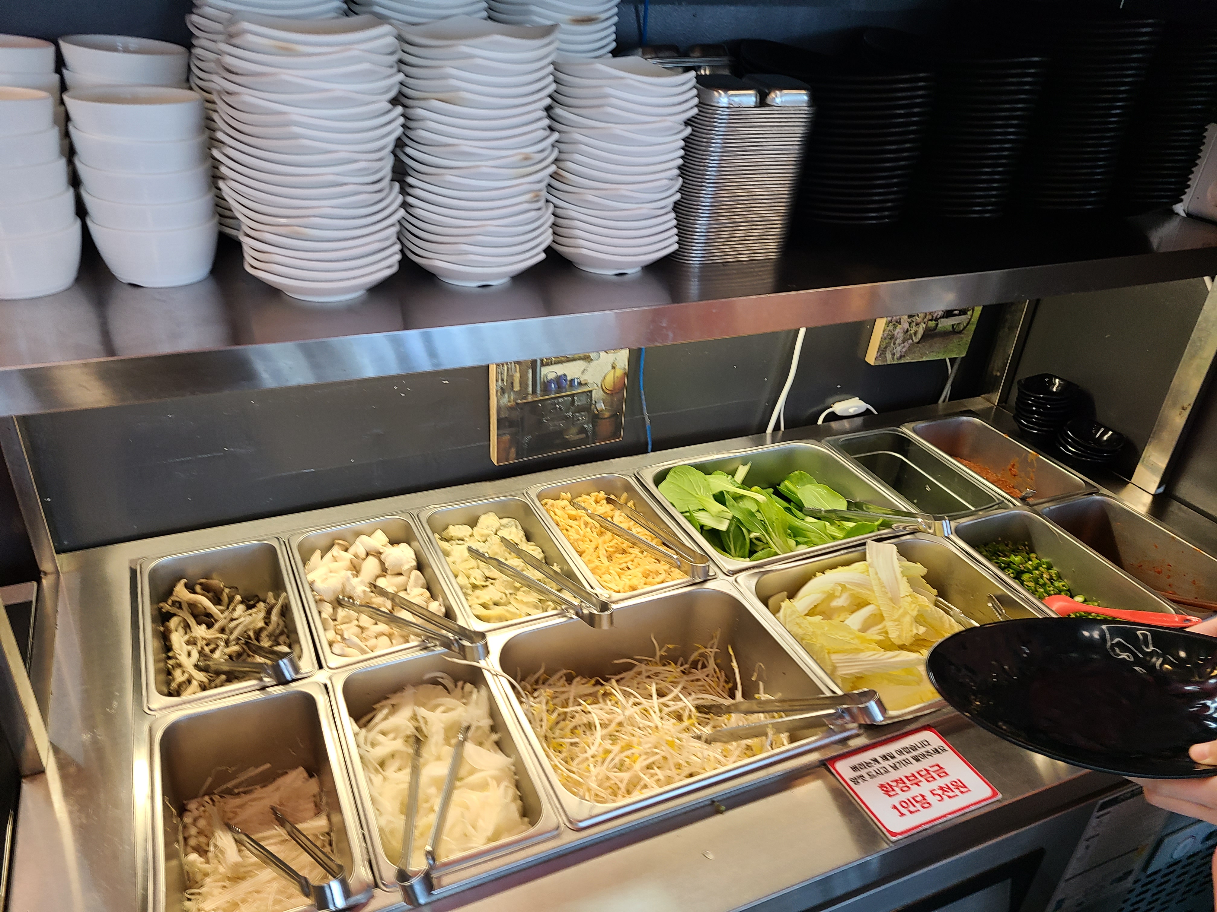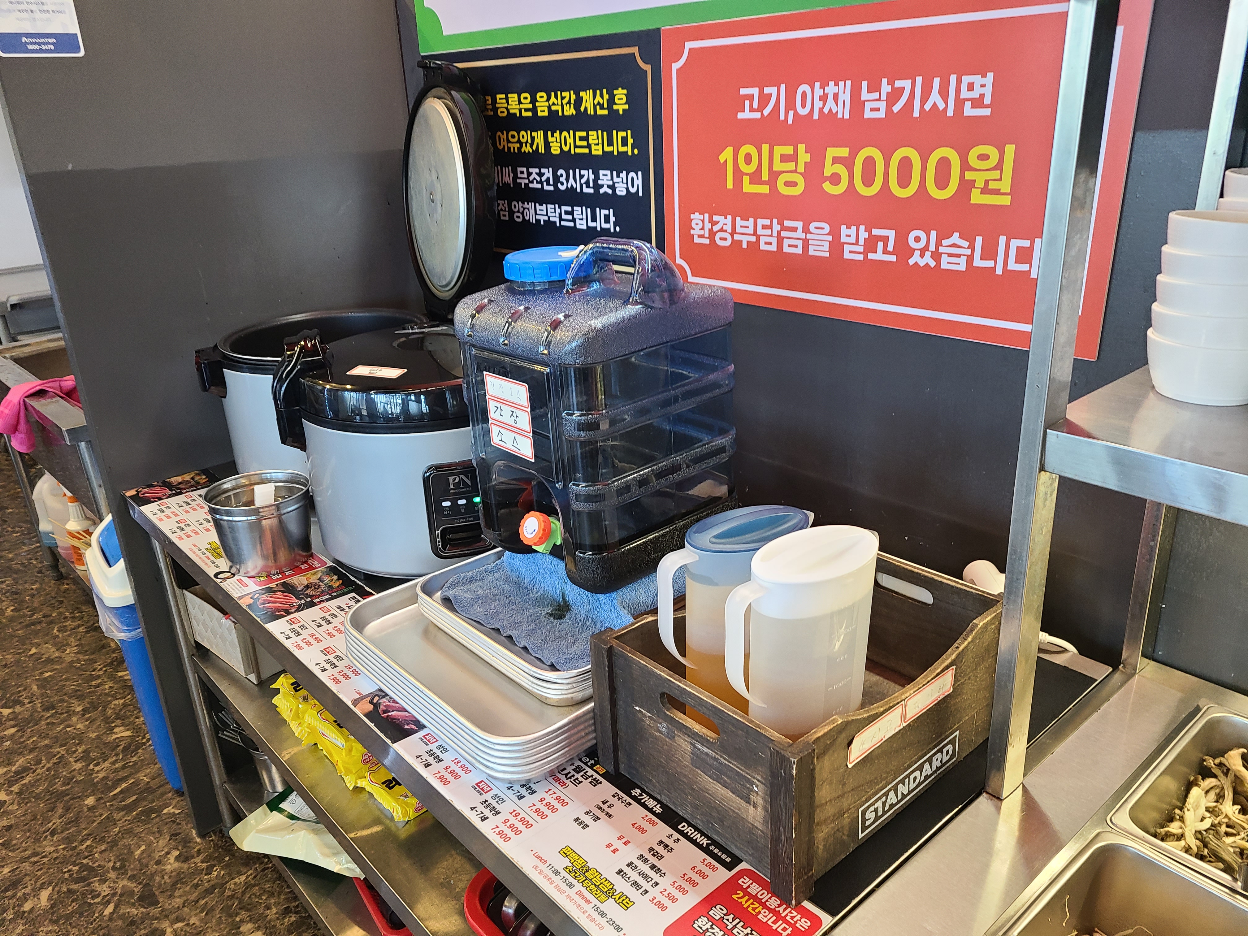 3. 셀프바엔 샤브샤브용 야채, 소스, 고기등이 놓여져 있었어요. 무한으로 먹을수 있기때문에 주인장께서는 남기면 5천원 환경부담금을 내야한다고 경고(?)가 써있었습니다.