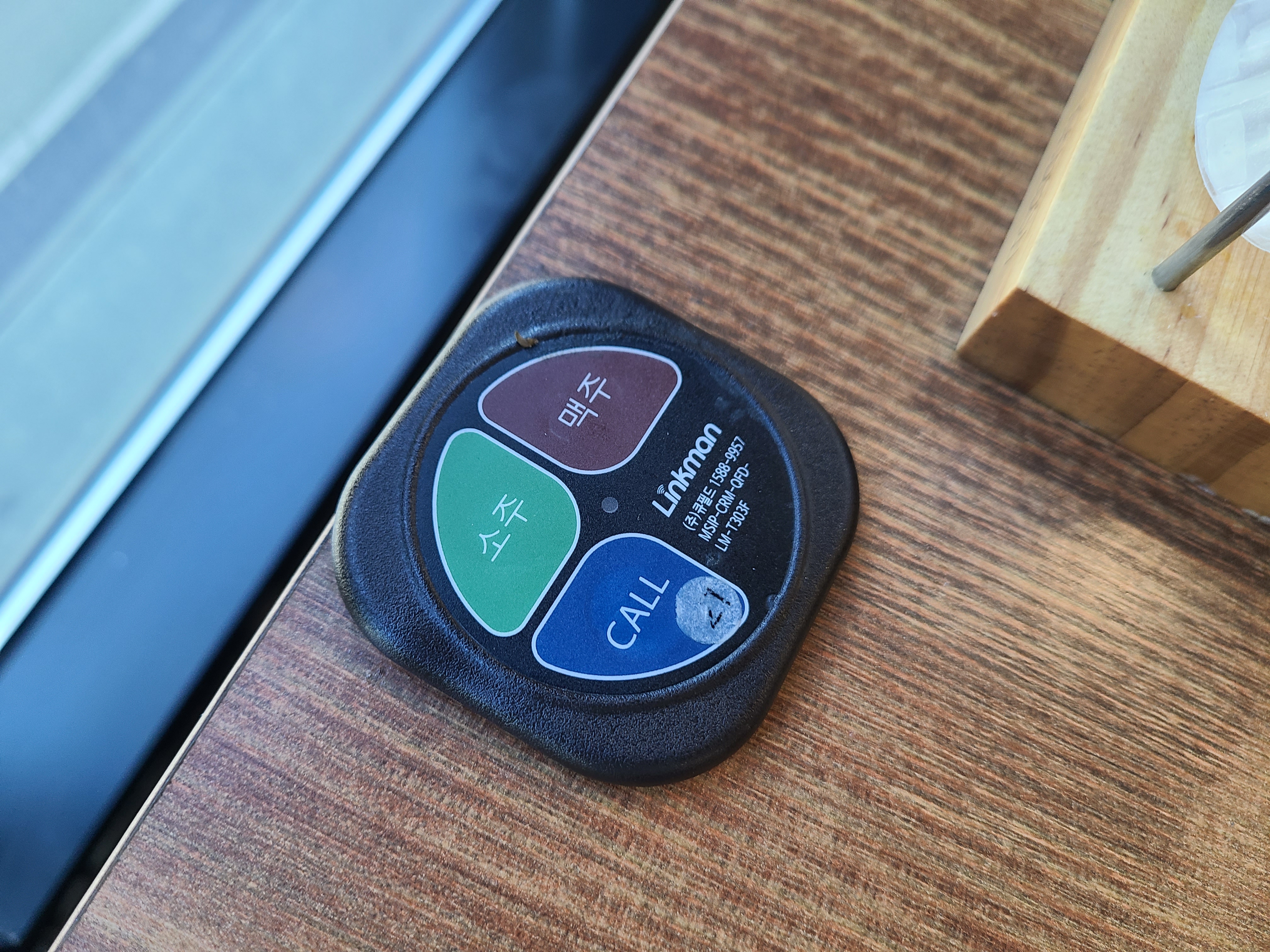 10. 종업원 호출키가 좀 특이해서 찍어봤어요. 아..여기 병맥주가 6천원이에요. 아무래도 무한이다보니 술값이 좀 비쌉니다. 소주, 막걸리는 5천원이에요.