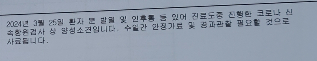 주사 한방 맞고 검사 결과가 나올때까지 기다렸습니다. 검사결과 코로나 양성 판정되었습니다. 독감은 아니라고 합니다. 코로나는 독감처럼 약이 있는게 아니라서 증상을 완화할 수 있는 약처방밖에 못한다고 합니다. 어쩔수 없죠.