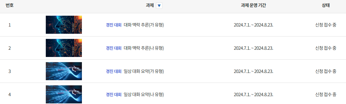 총 4개 부문으로 참가 가능한데 일단 대화 맥락 추론(가 유형)으로 참가중입니다.