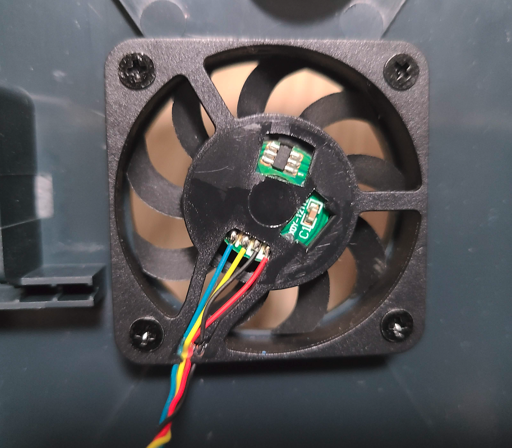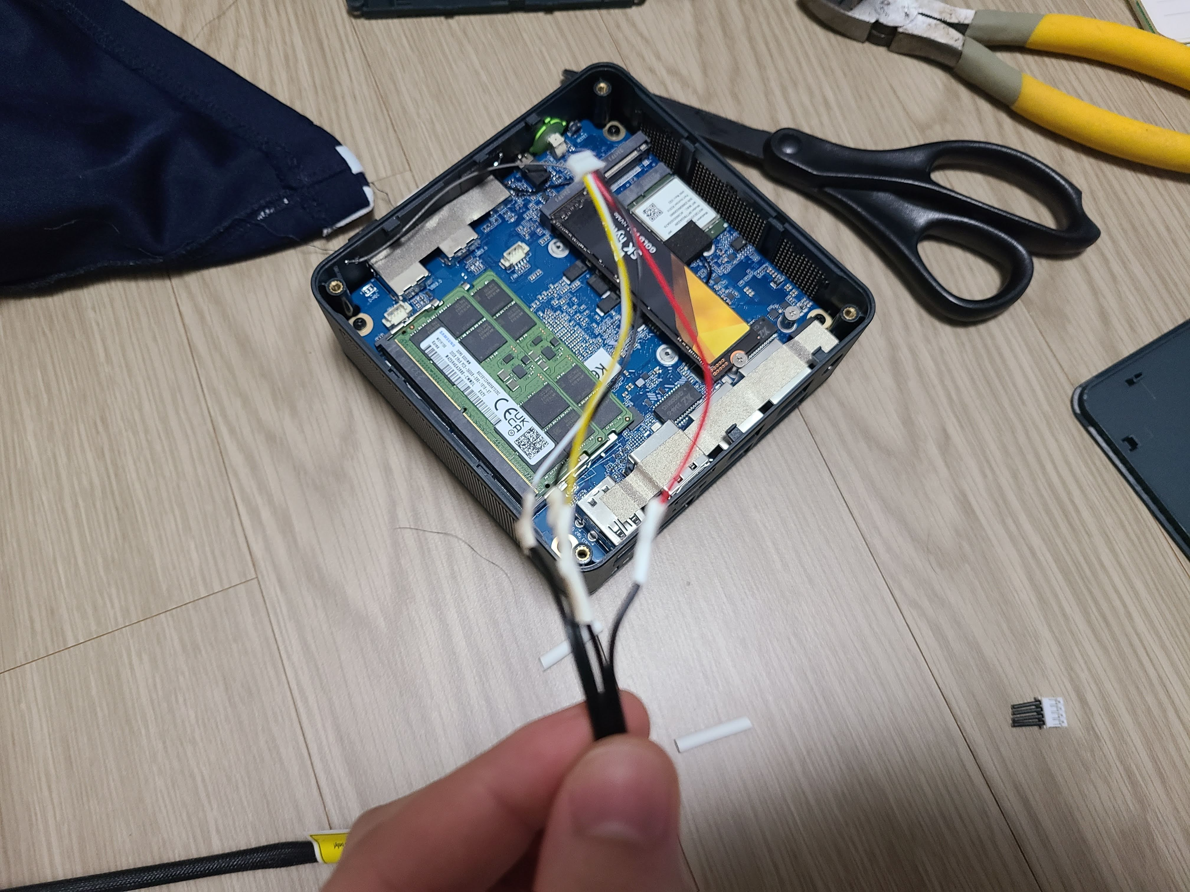 1. 팬의 핀아웃 조사를 해야합니다. 작업하기 전 기억력이 좋지 못한 분들은 까먹을 수 있으니 기존 미니피씨 보드에 연결되어 있는 기존팬의 단자를 사진 찍어 둡니다. 기존팬은 VCC, GND, PWM, RPM으로 구성된 4PIN FAN입니다. 기존팬을 멀티메터로 전압을 하나하나 찍습니다. 멀티매터에 5V라고 나오는게 VCC이고 0V라고 나오는게 GND입니다. PWM이랑 RPM이 헷갈렸는데 gpt4o가 전압 높은게 RPM이라고 알려줘서 믿고 진행했습니다.