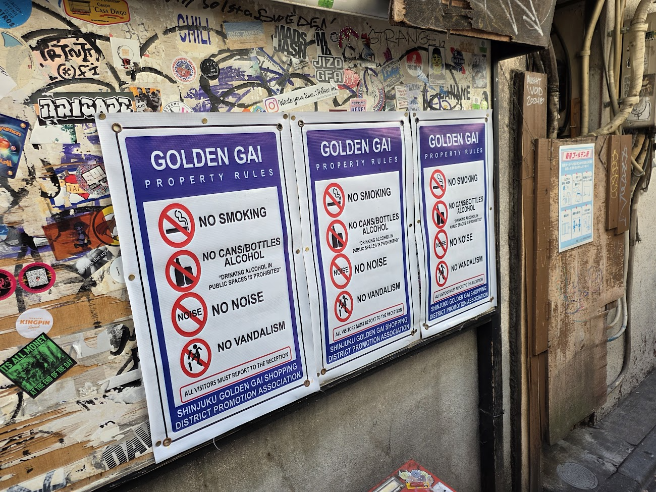 골든가이에서는 금연, 걸으면서 음주 금지, 고성방가, 물건 파손 금지 등 지켜달라는 안내문구가 있었어요. 음주 금지(가게 내에서만 가능)는 내 맘 아닌가 싶기도 한데 가게들 매상 올려야하기때문에 여기 상인회에서 이렇게 법아닌 법을 만든것 같았습니다.