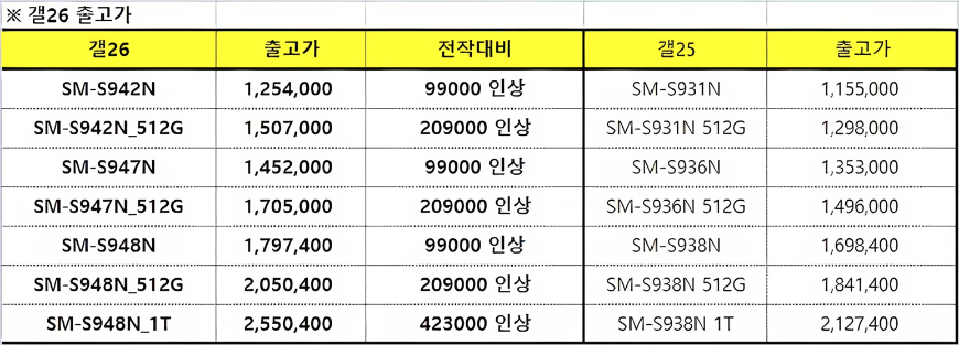 가격은 메모리 가격 상승으로 인해 인상될 전망입니다. 예상 인상액은 256GB 기준 99,000원, 512GB 기준 209,000원, 1TB 기준 423,000원 수준입니다. 이에 따라 아이폰과의 가격 차이가 줄어들어, 가성비 측면에서의 우위를 유지하기 어려워질 수 있습니다. 다만, 사전 예약 시에는 ‘더블 스토리지’ 프로모션이 제공될 가능성이 있습니다.